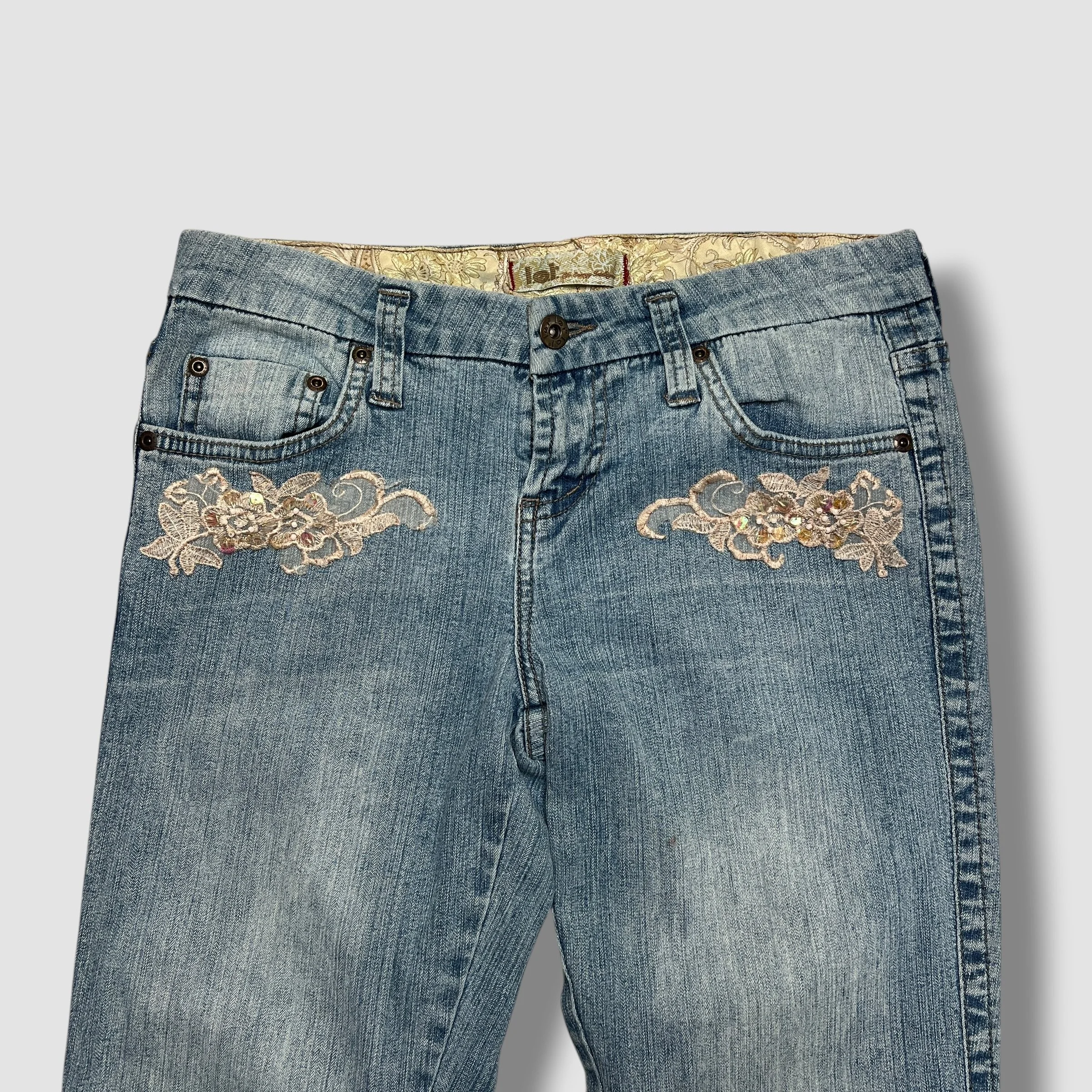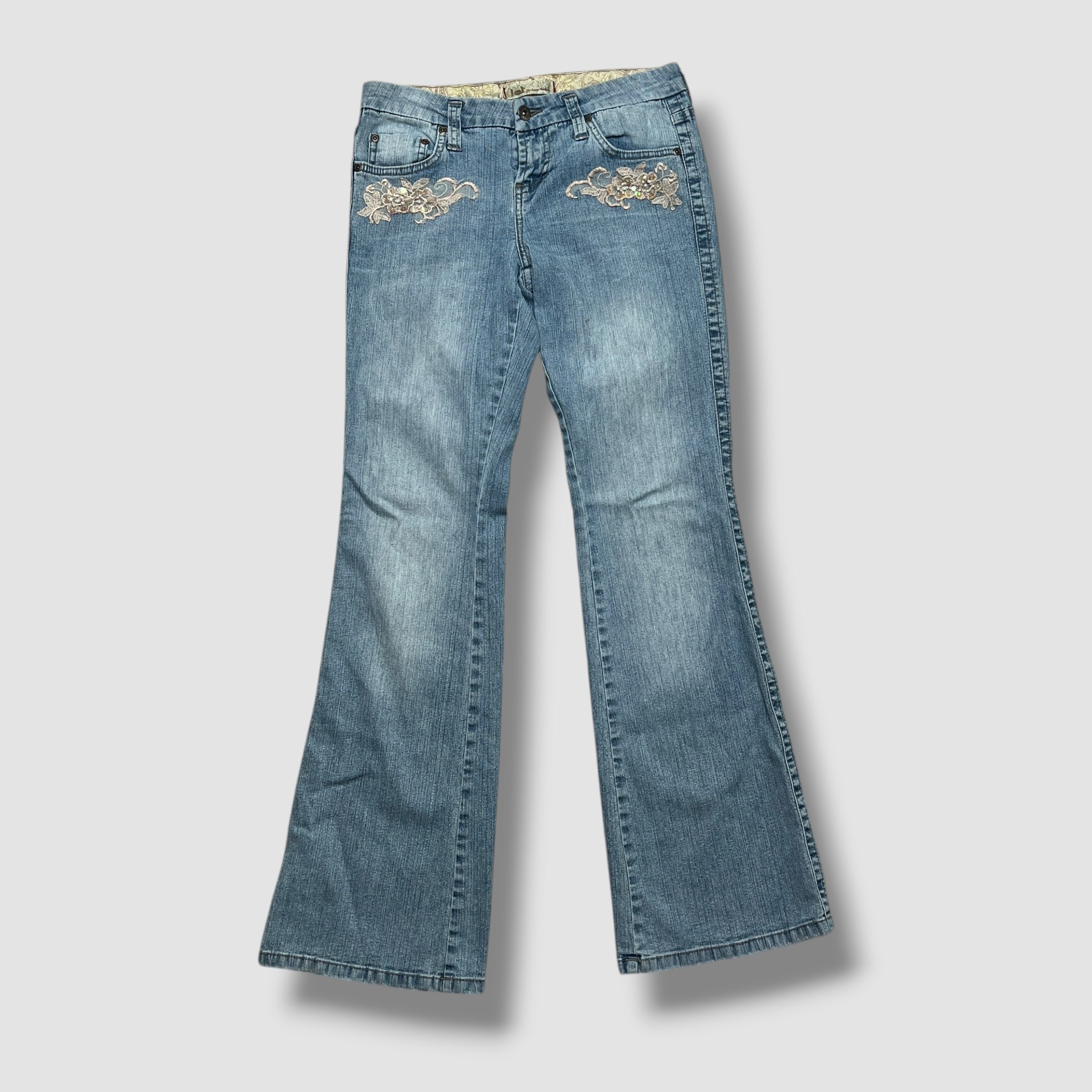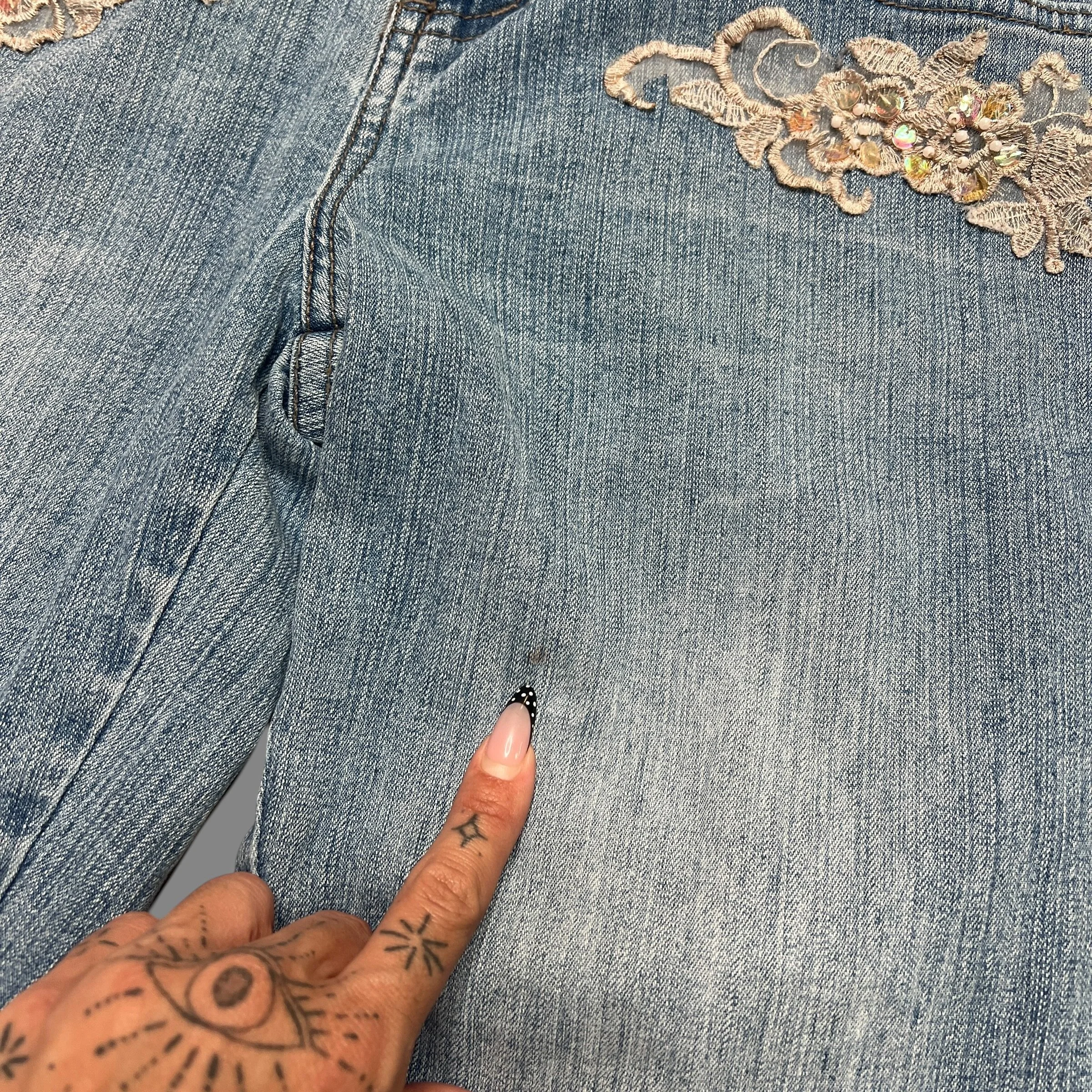 LEI Floral Embellished Sequin Denim Flare Jeans