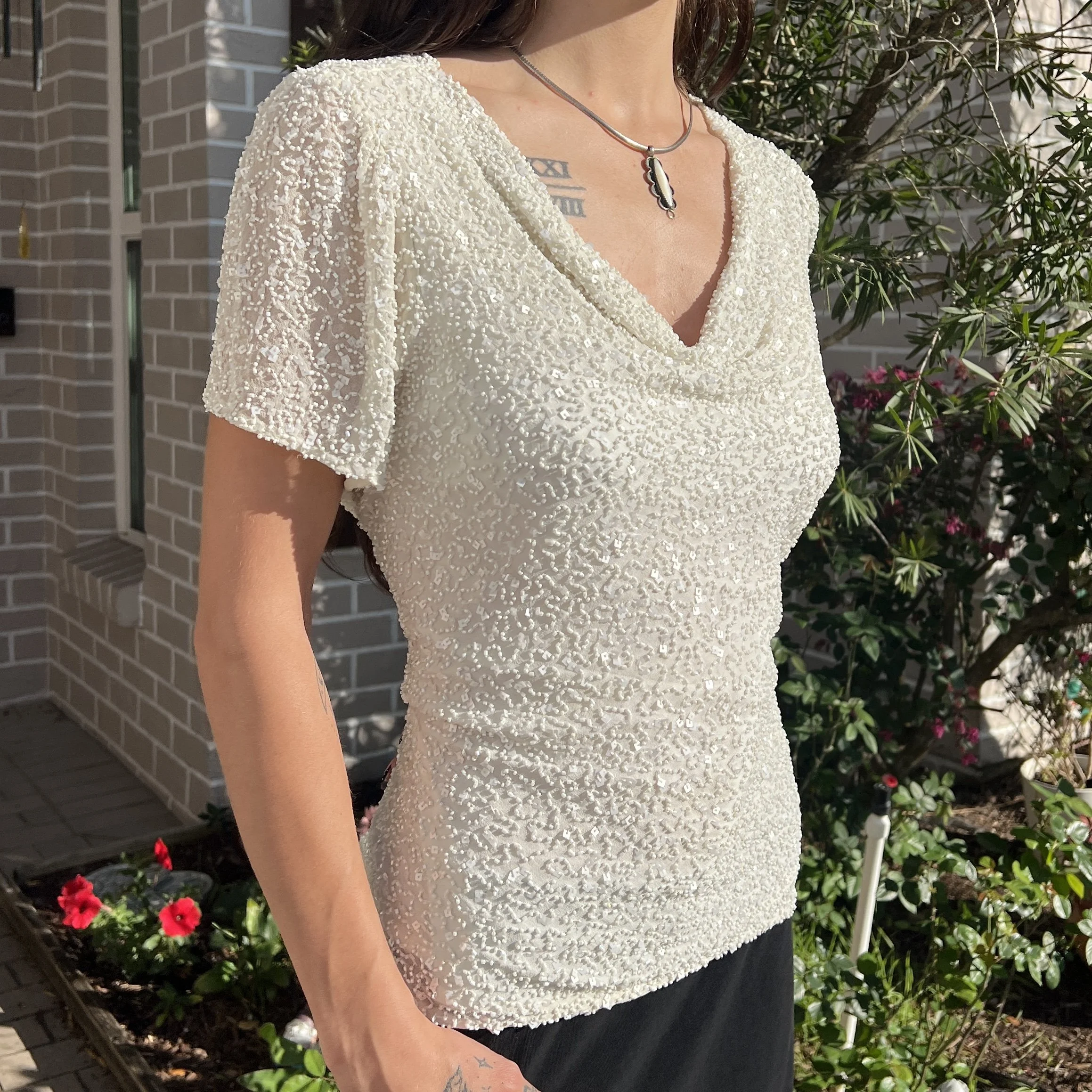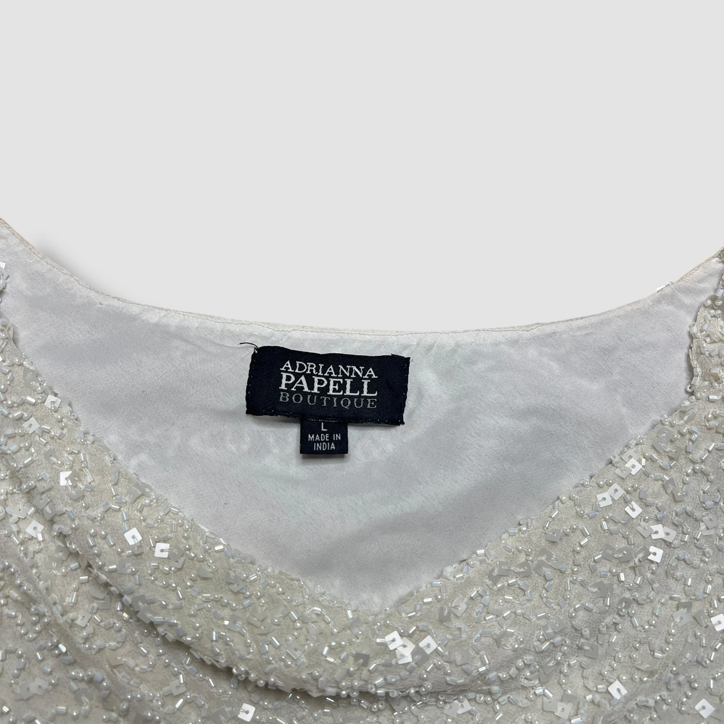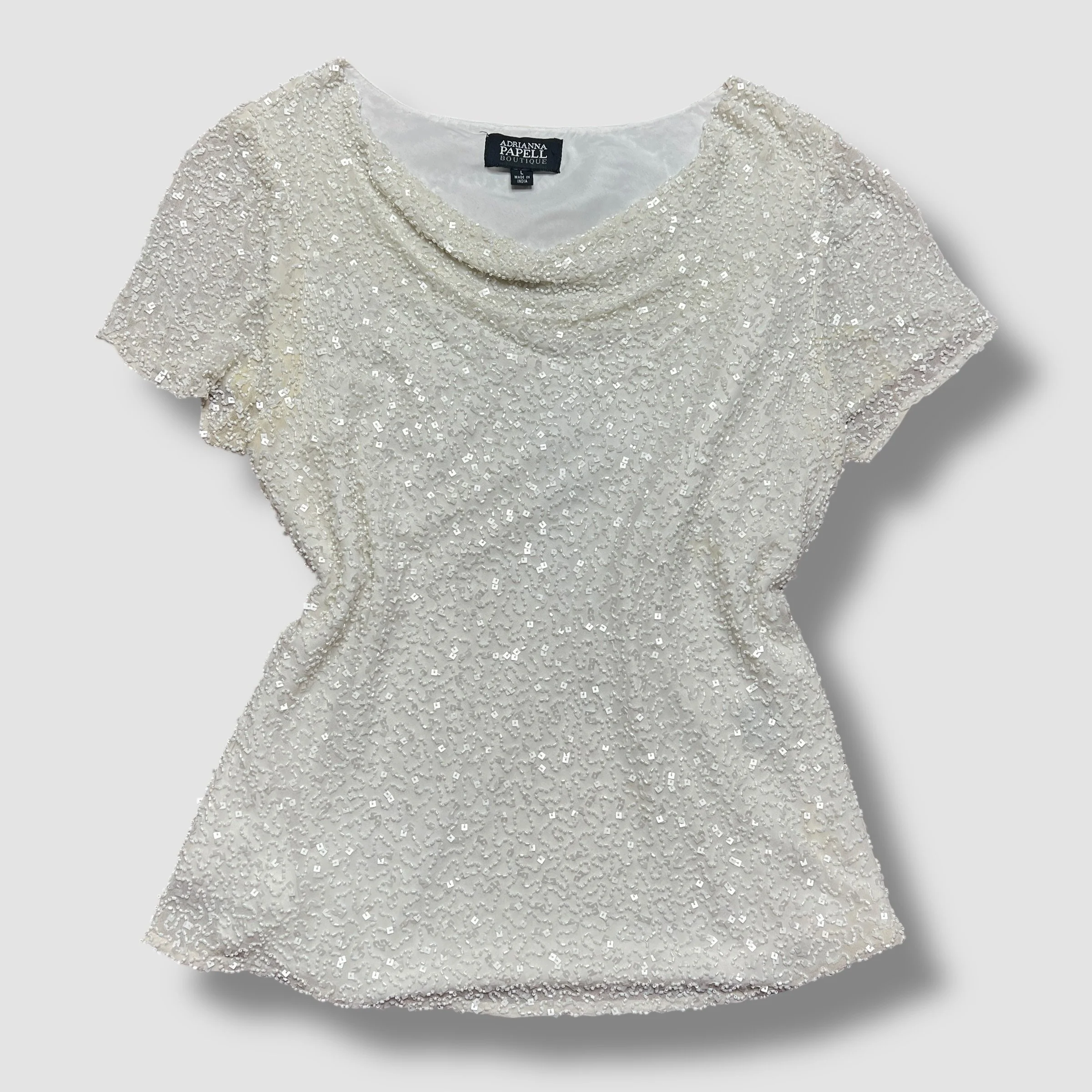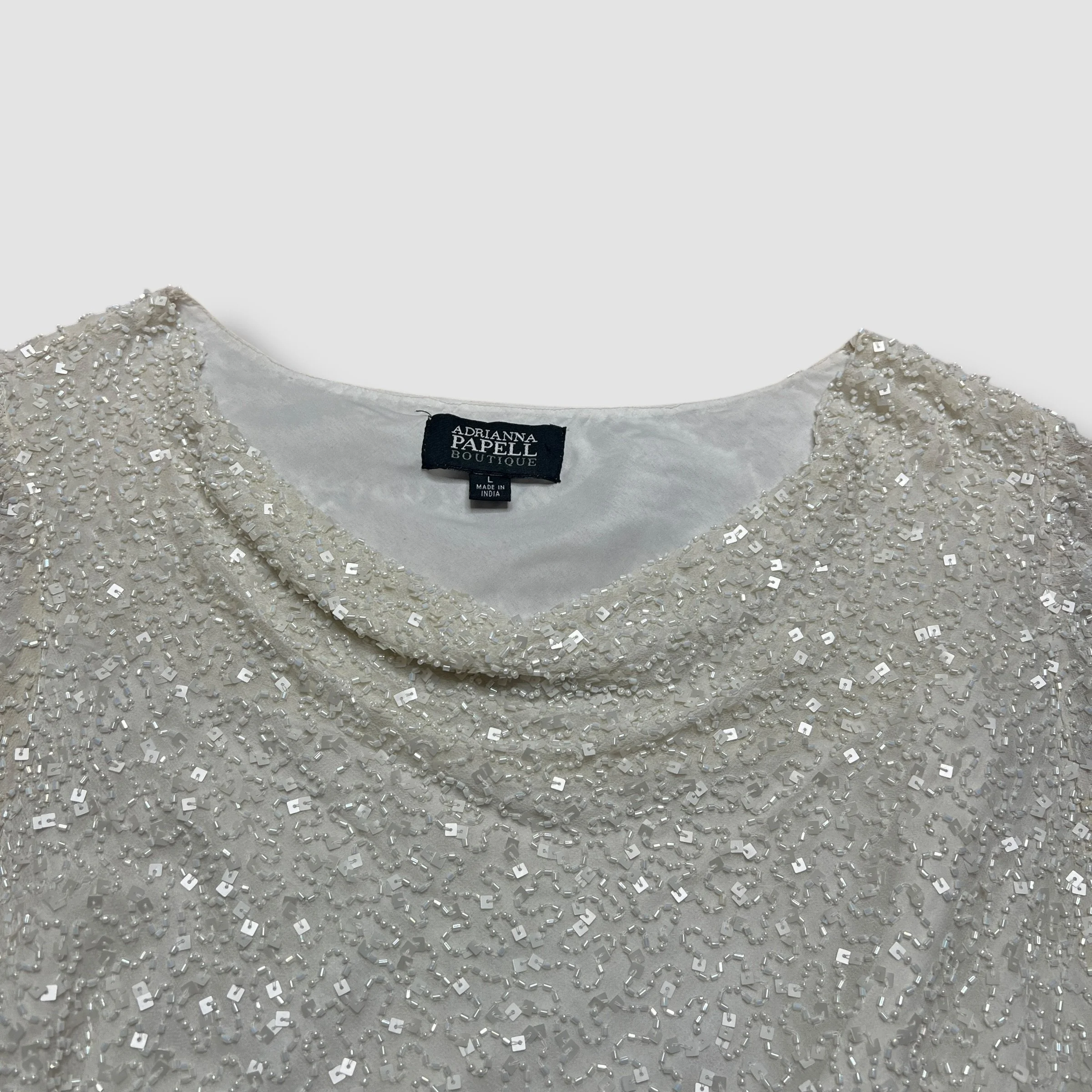 Adrianna Papell Boutique Cream White Beaded Silk Swoop Neck Top