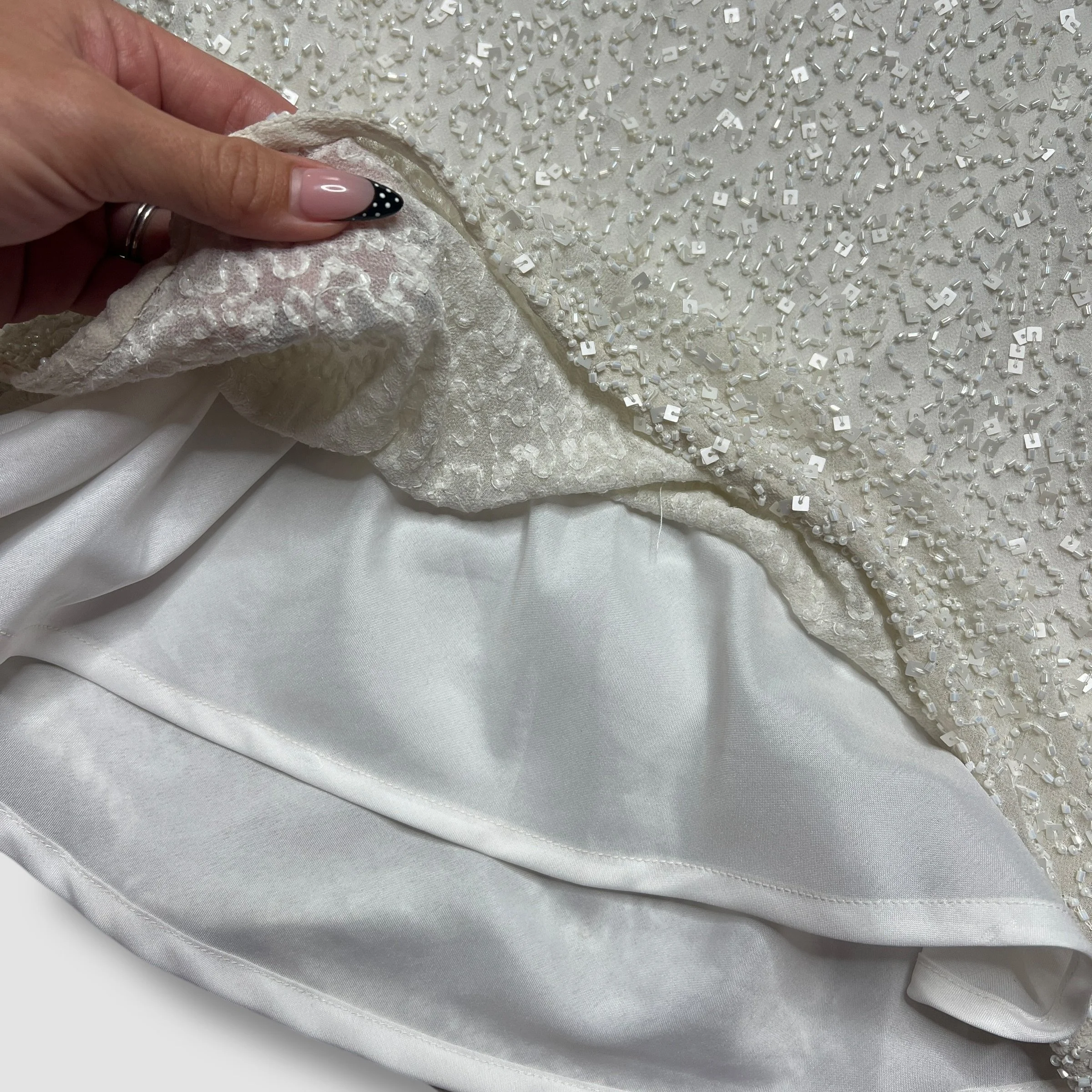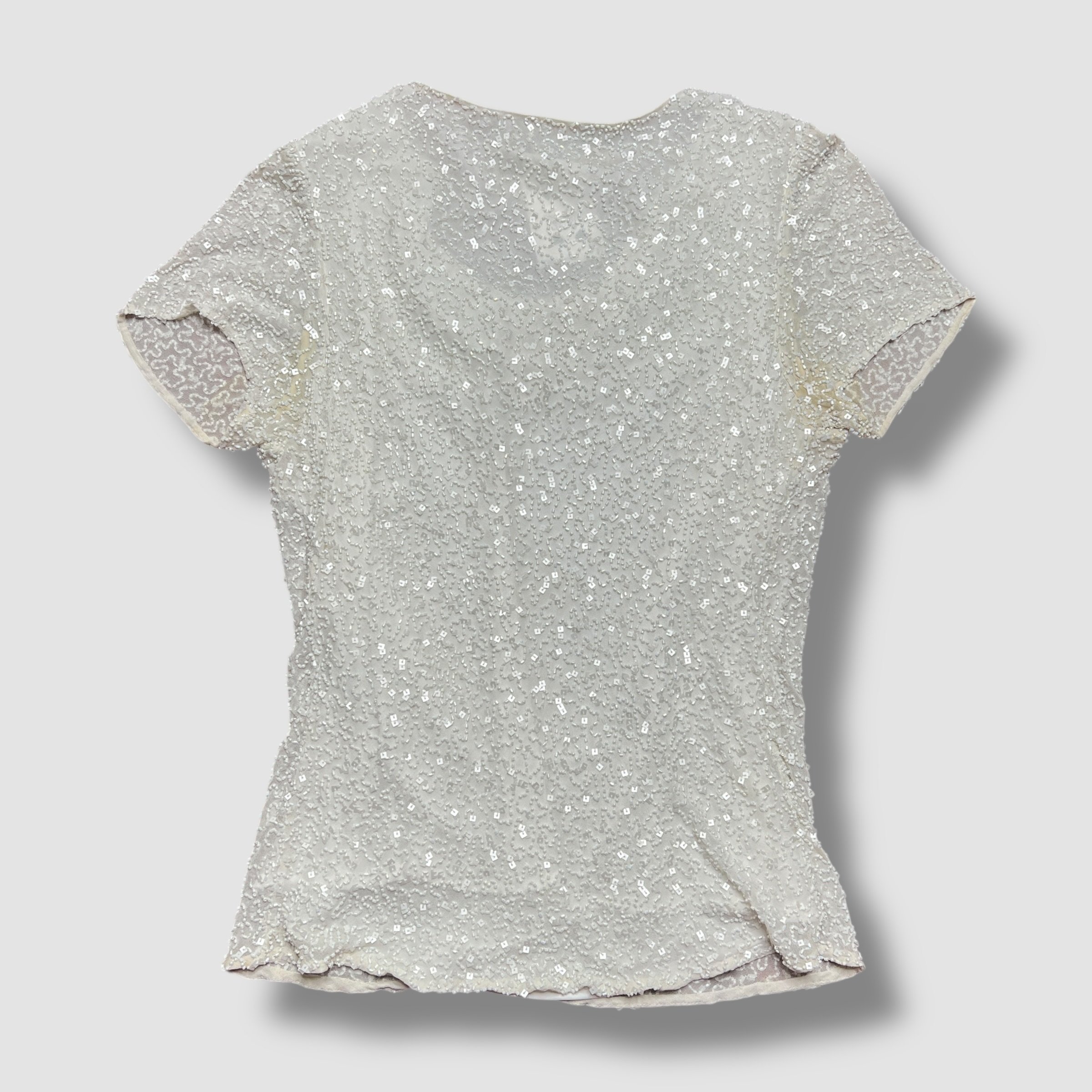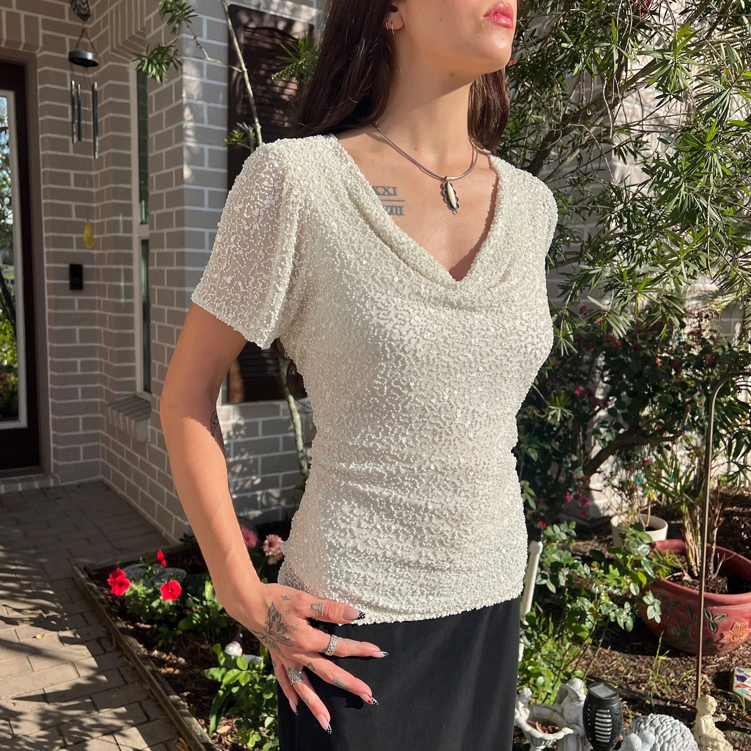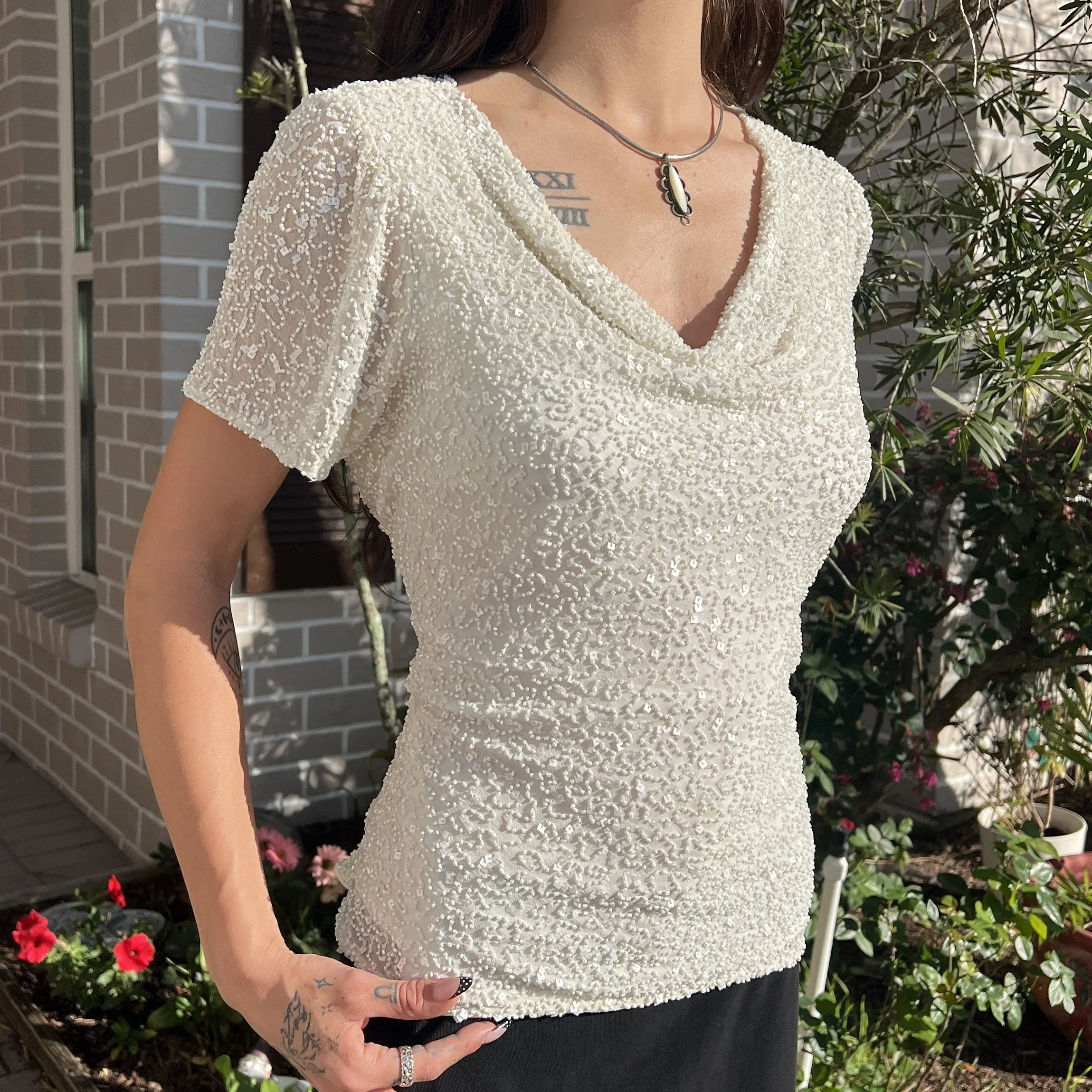 Adrianna Papell Boutique Cream White Beaded Silk Swoop Neck Top