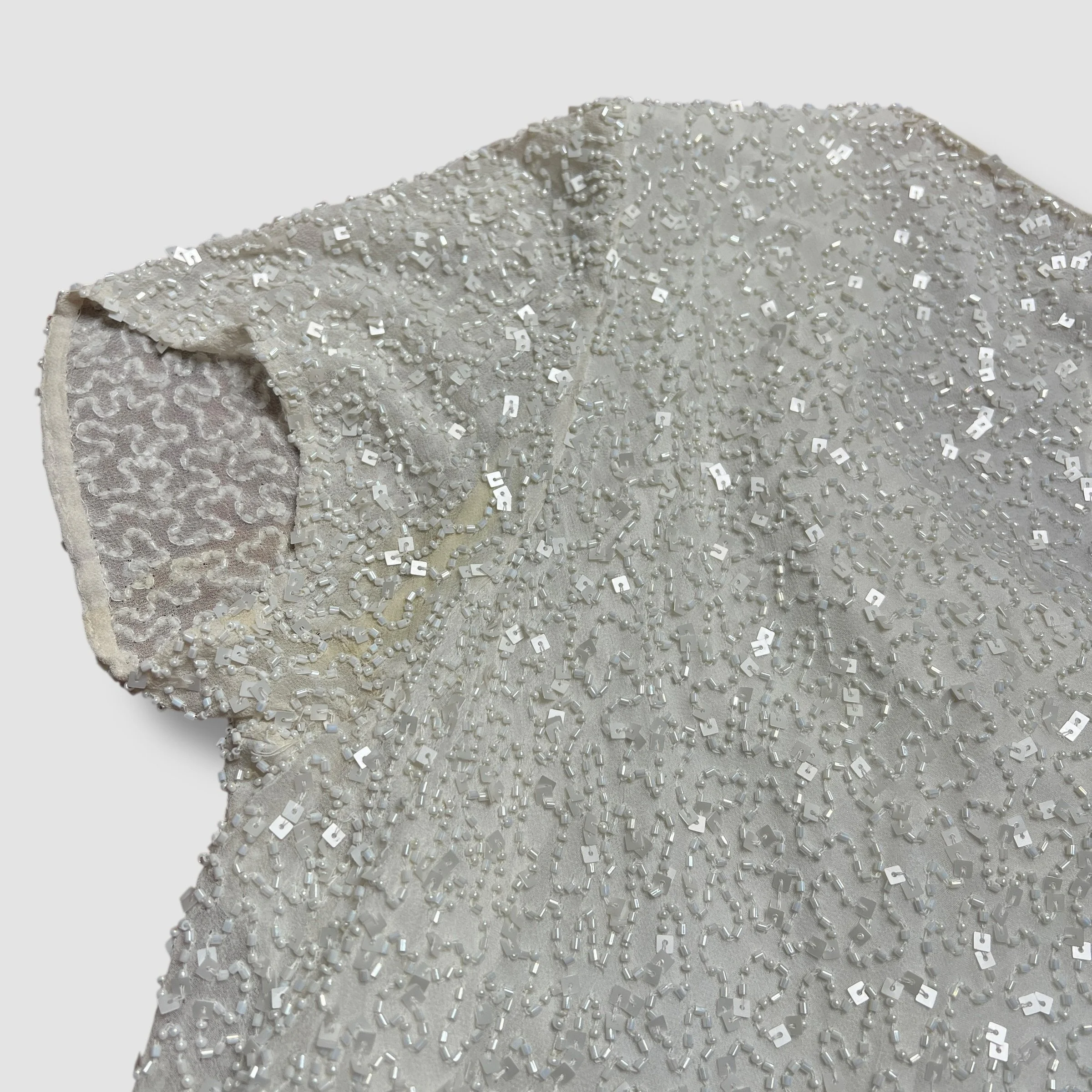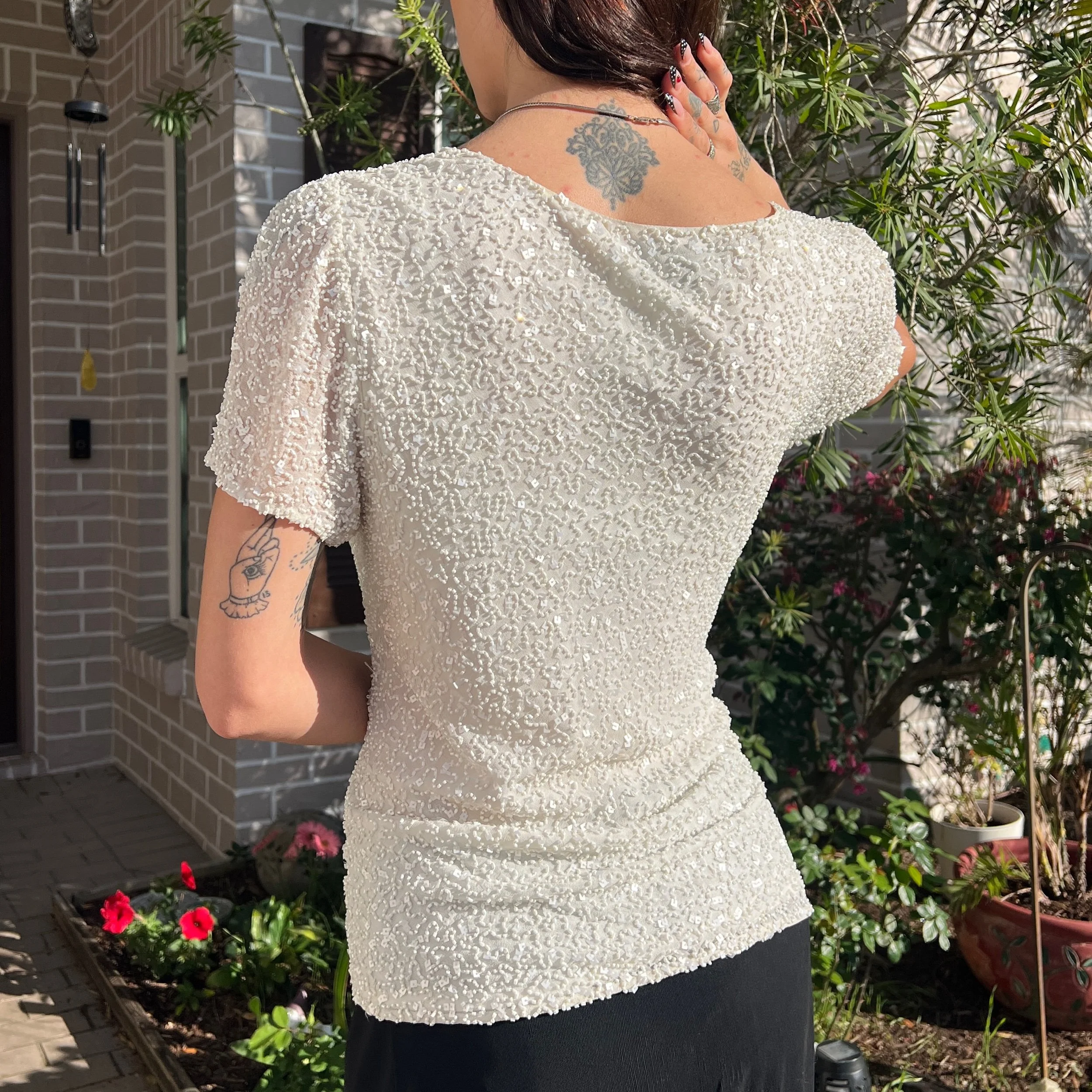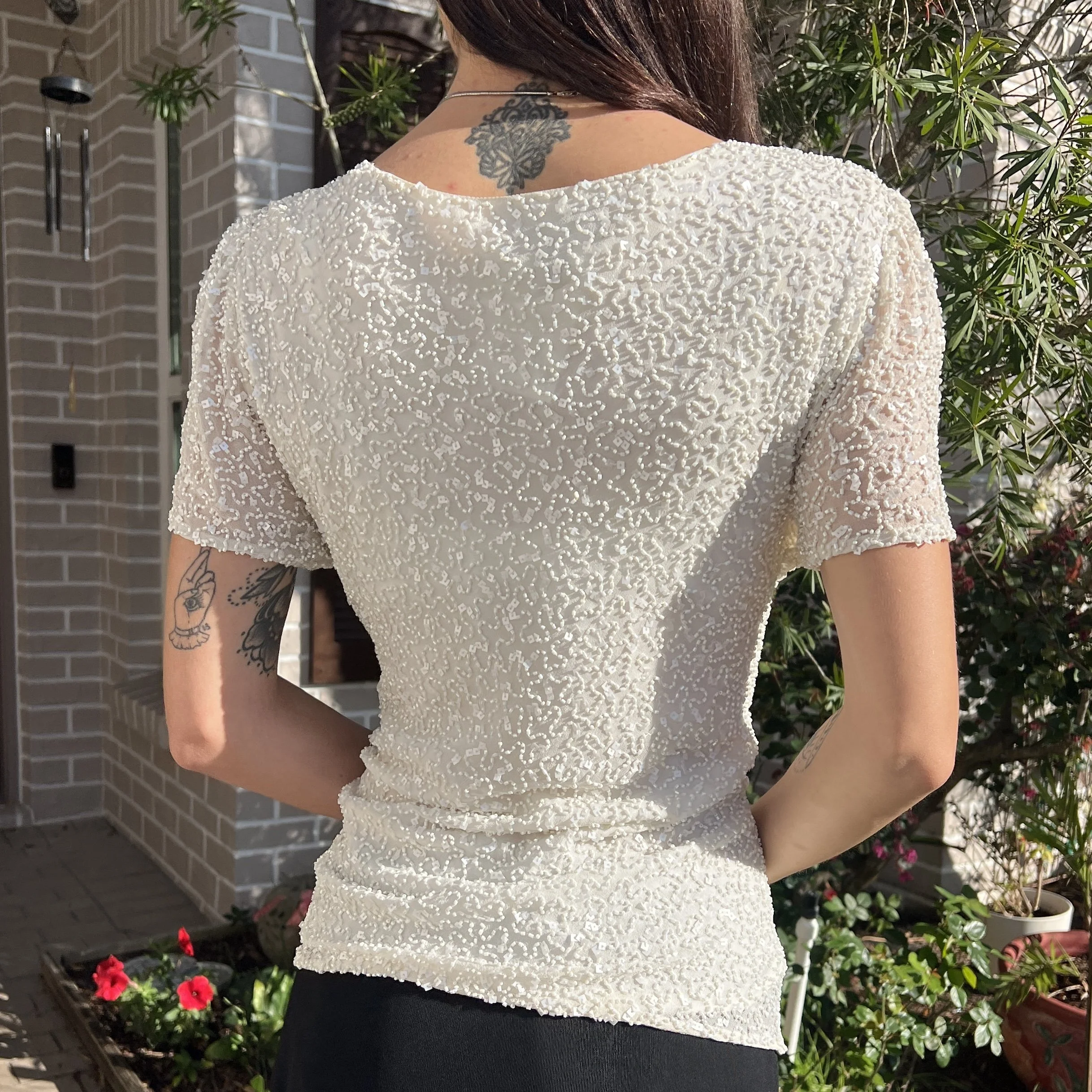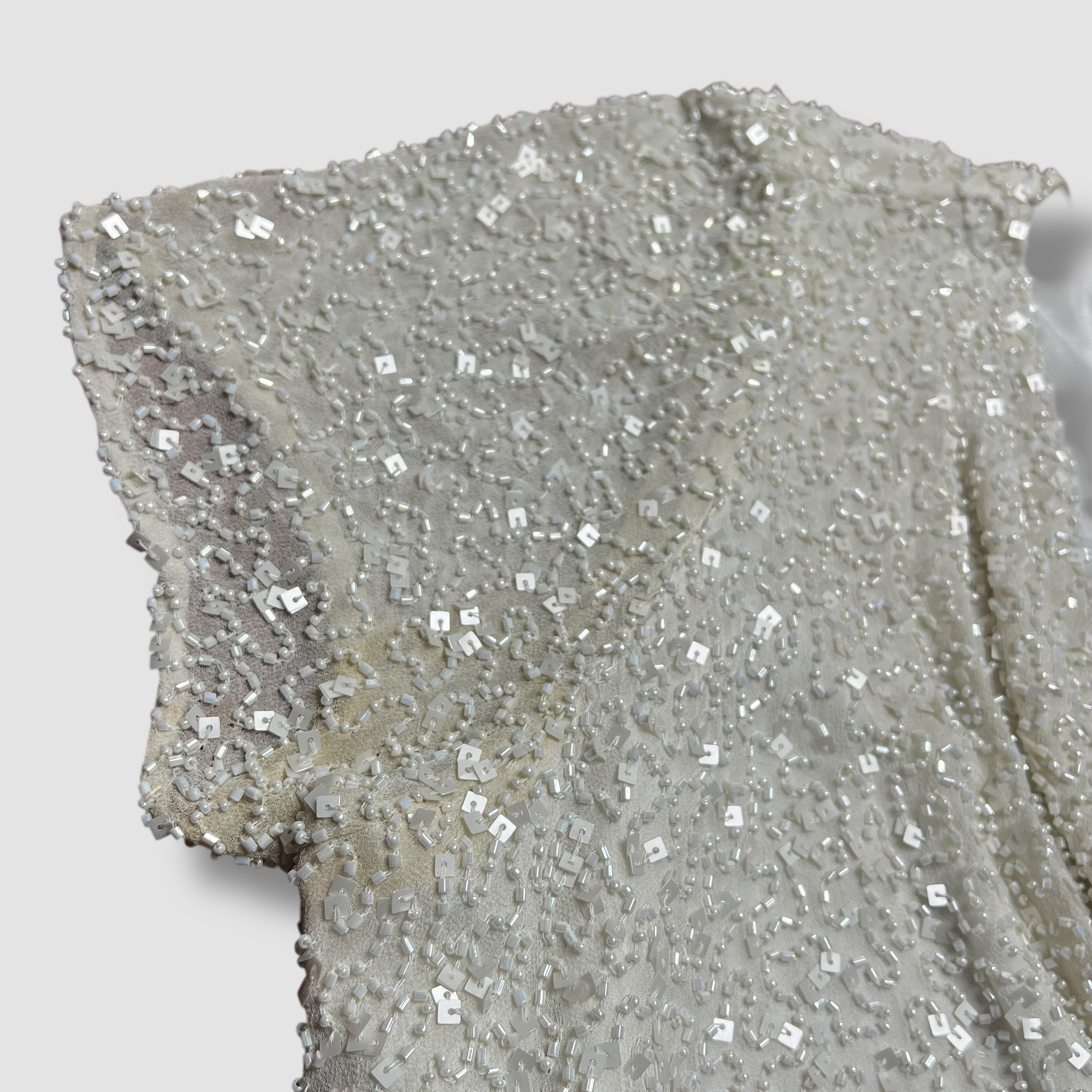 Adrianna Papell Boutique Cream White Beaded Silk Swoop Neck Top
