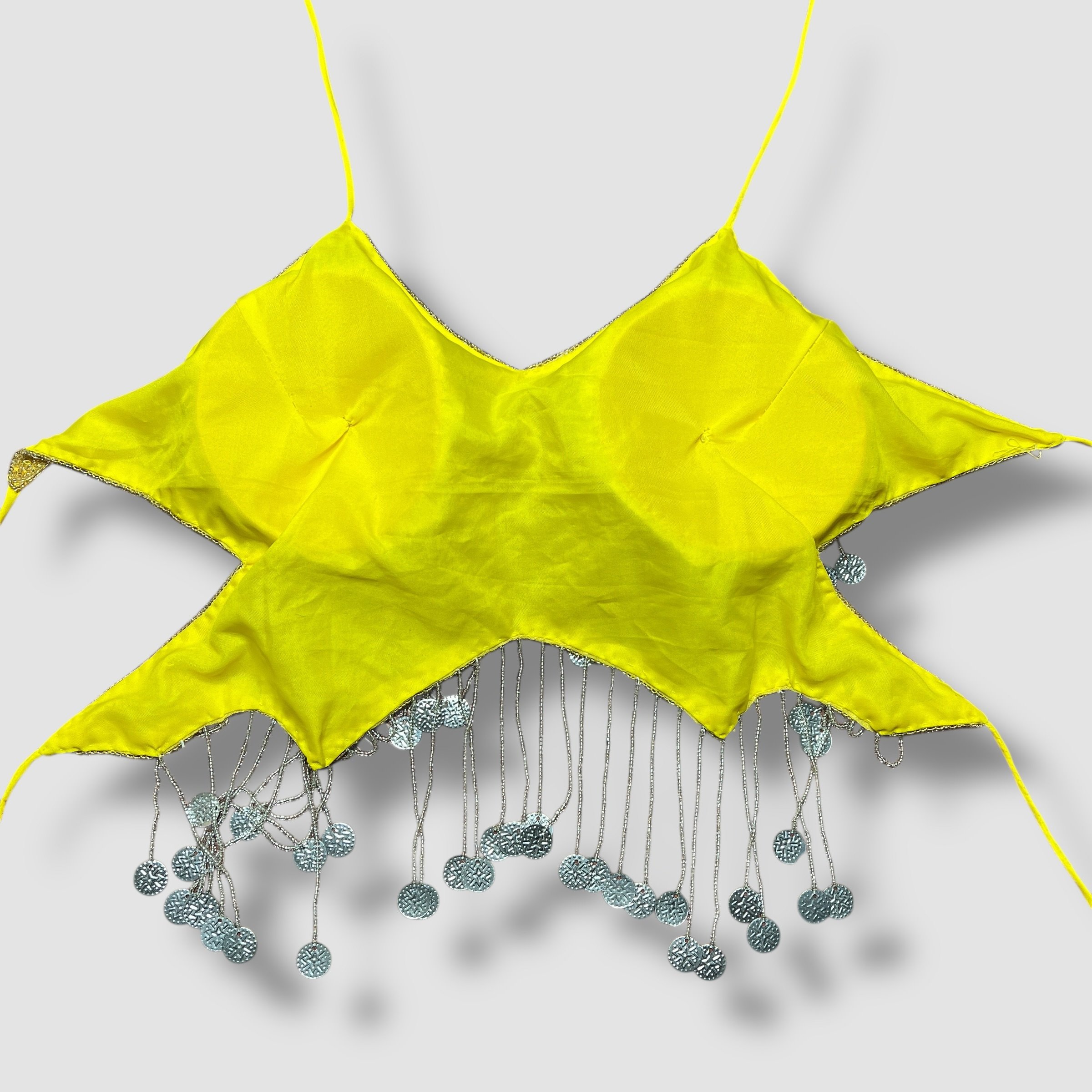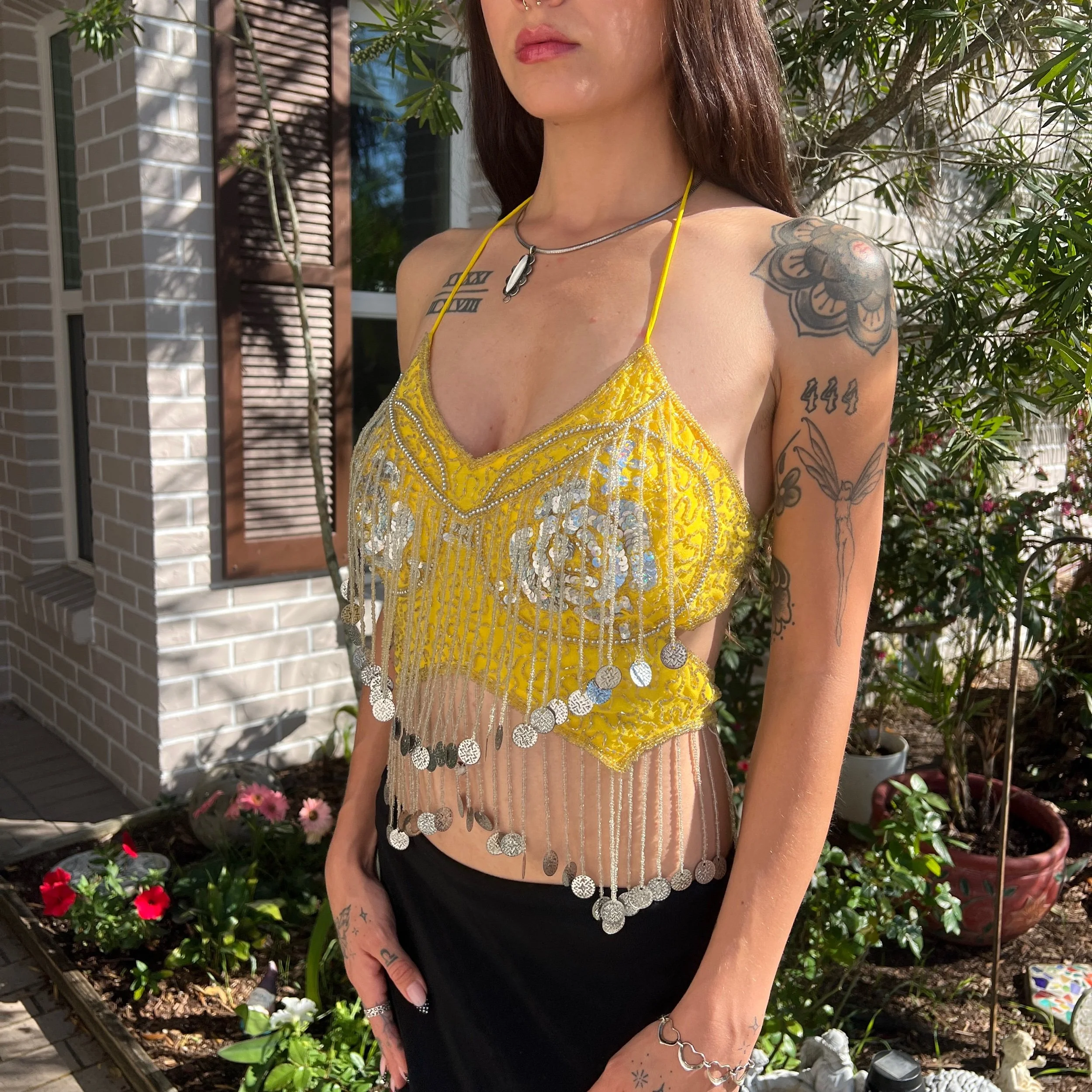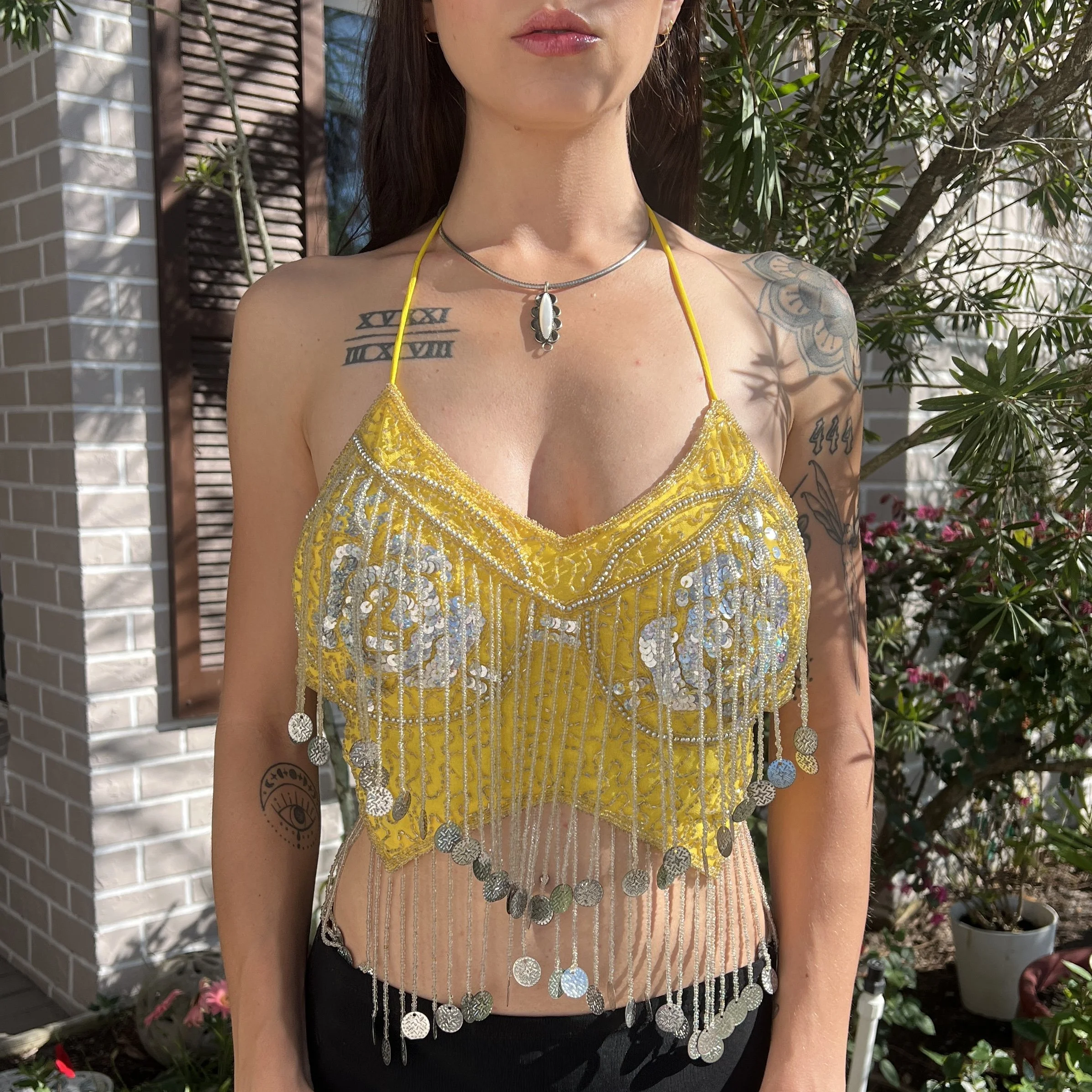 Butterfly Beaded Yellow & Silver Halter Top With Sequin Detailing