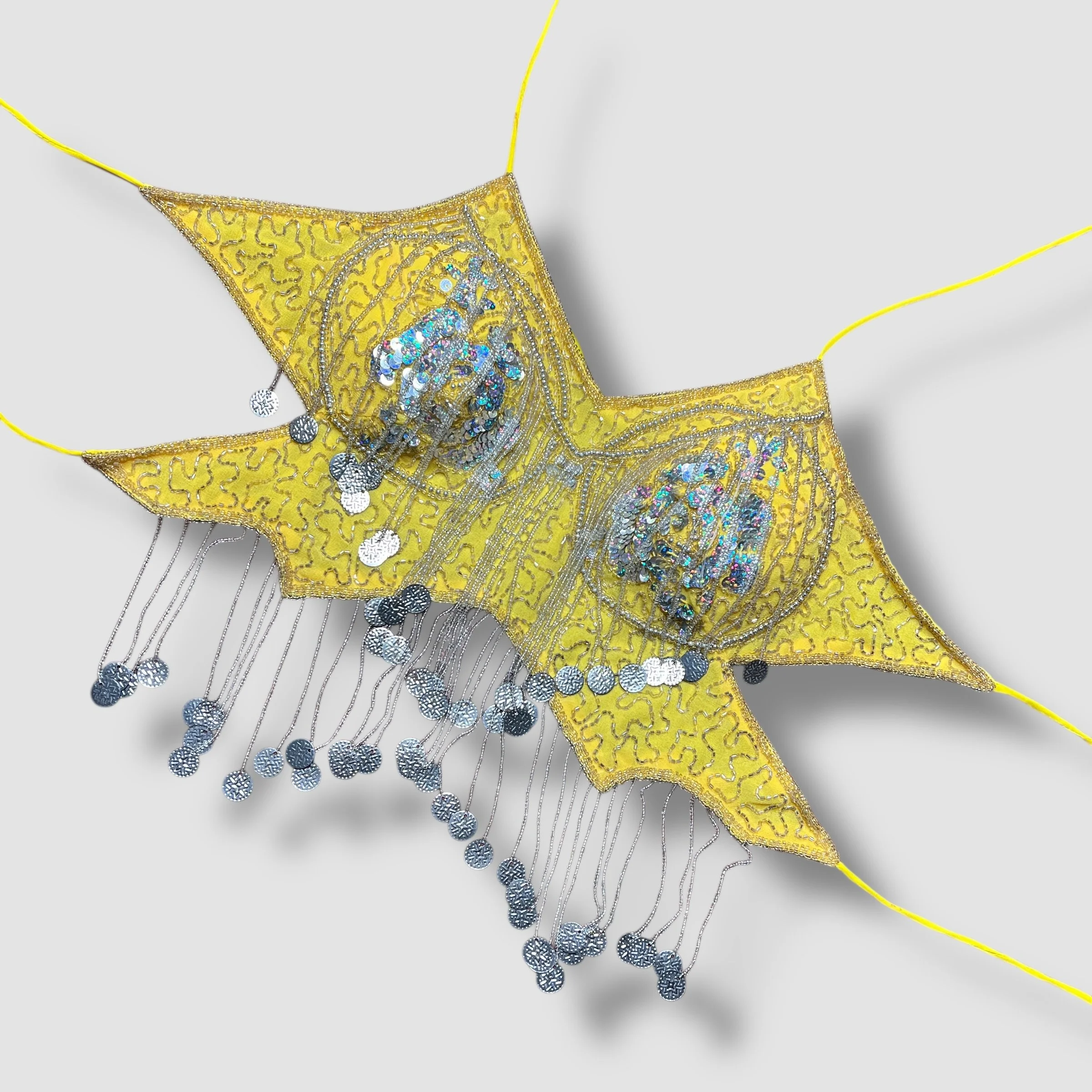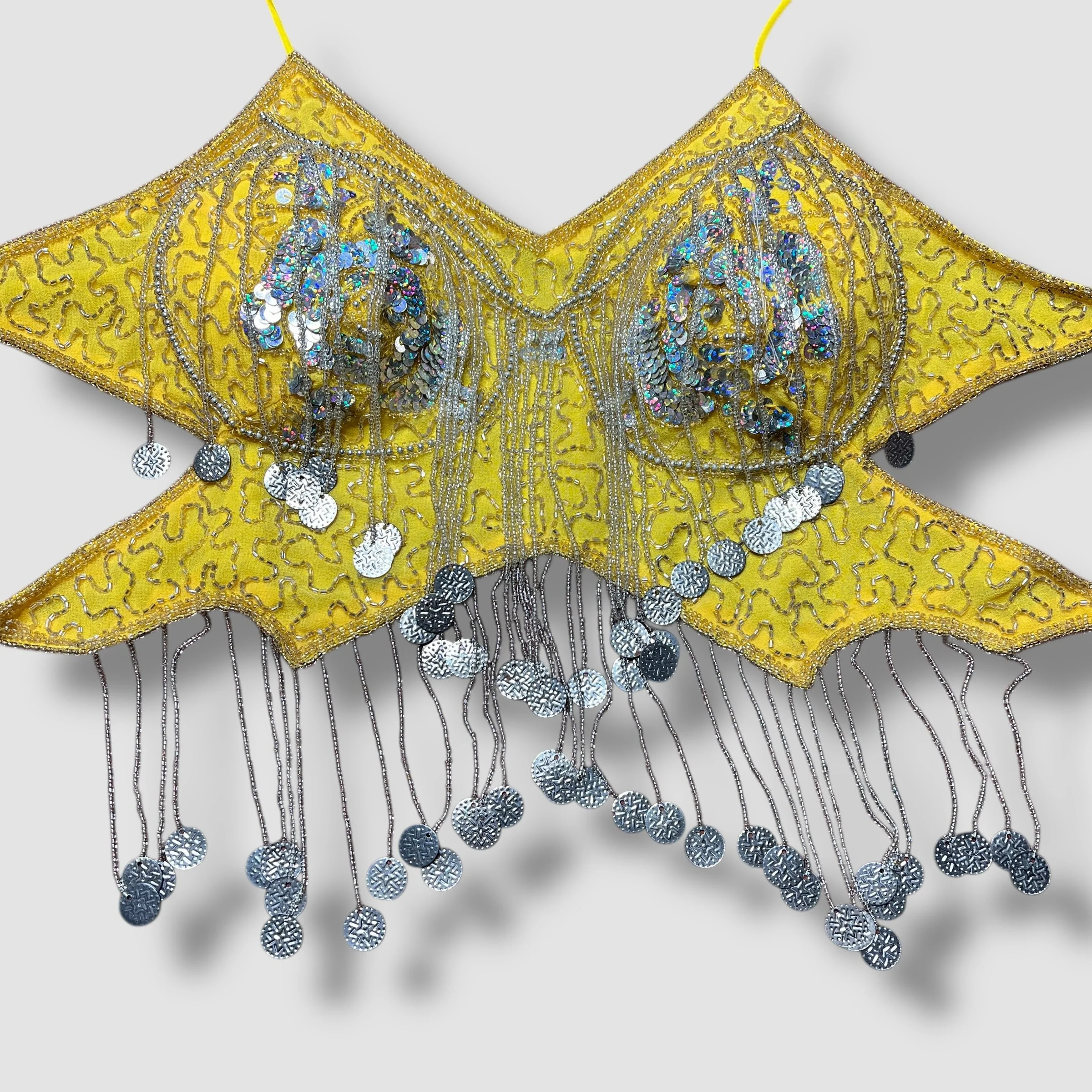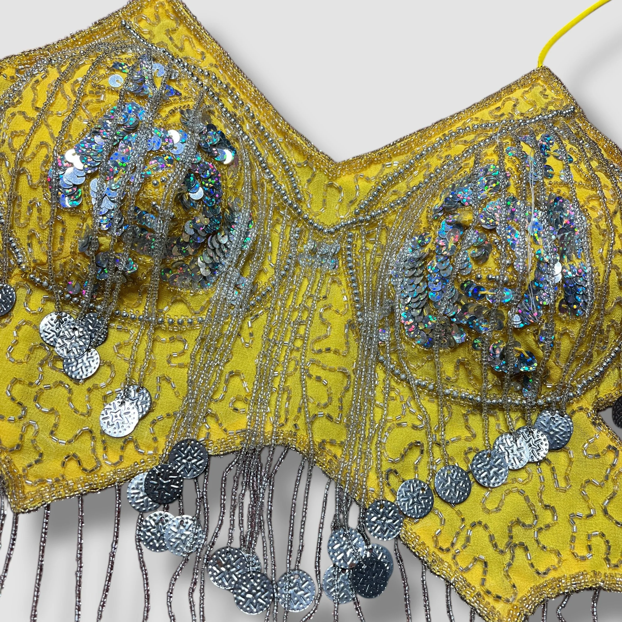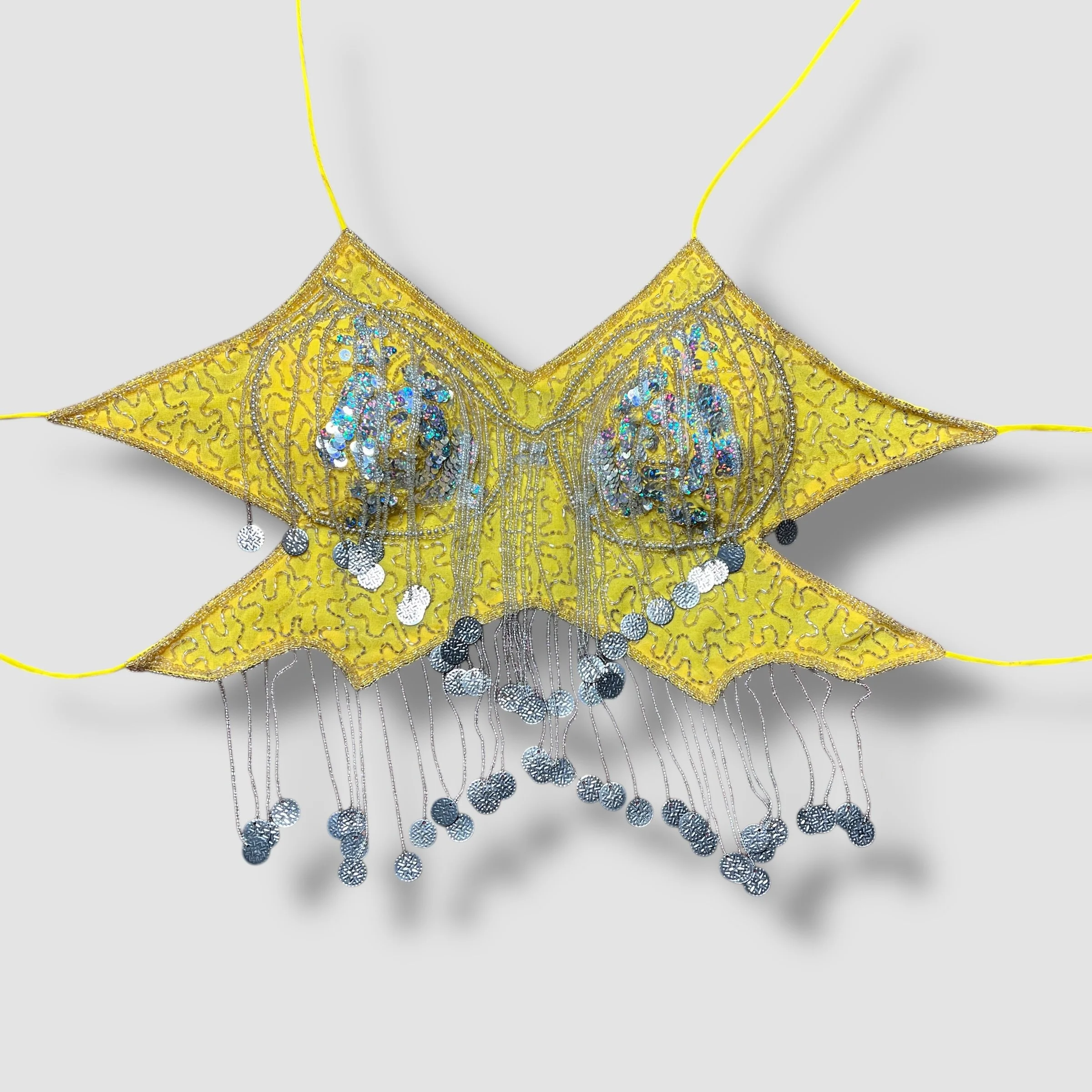 Butterfly Beaded Yellow & Silver Halter Top With Sequin Detailing