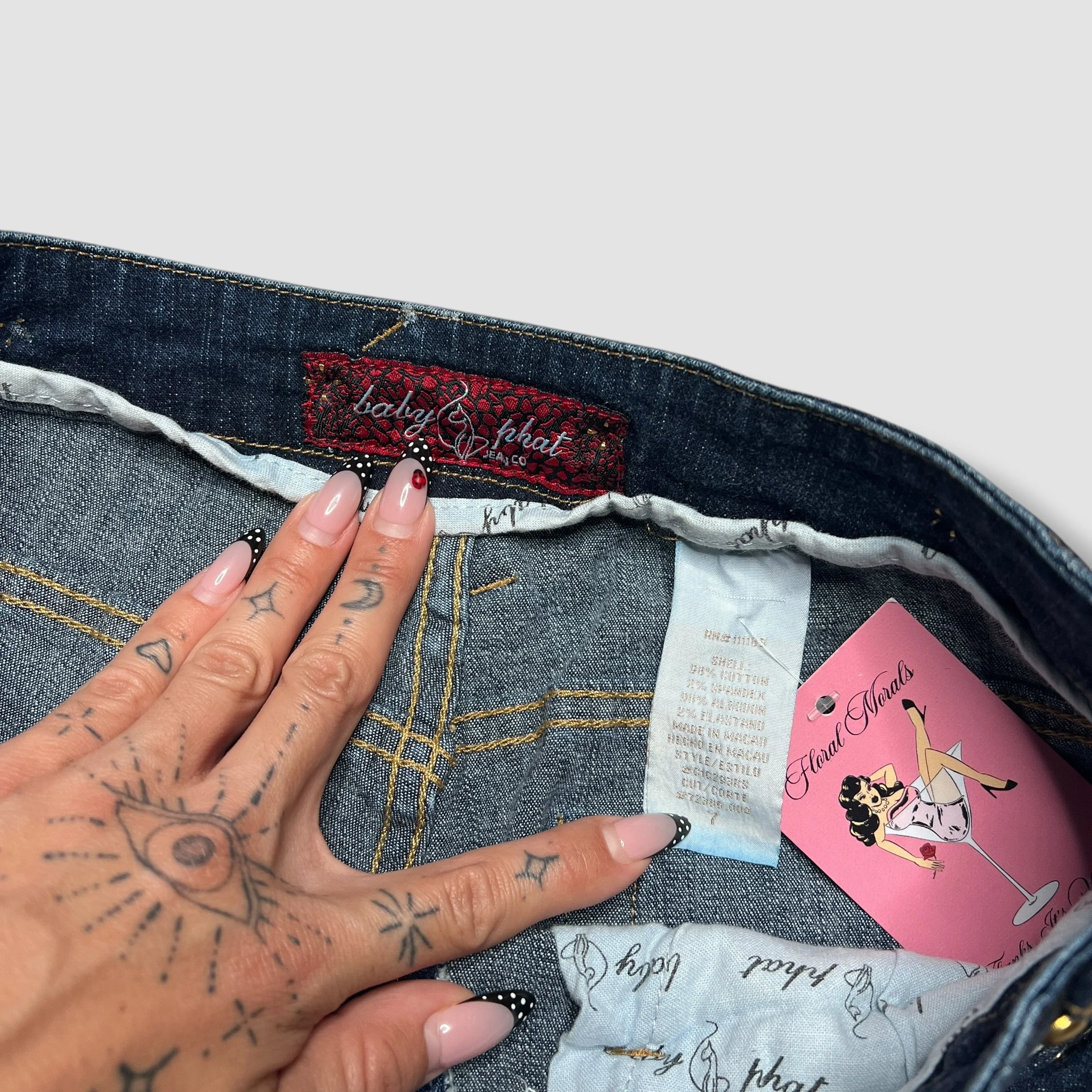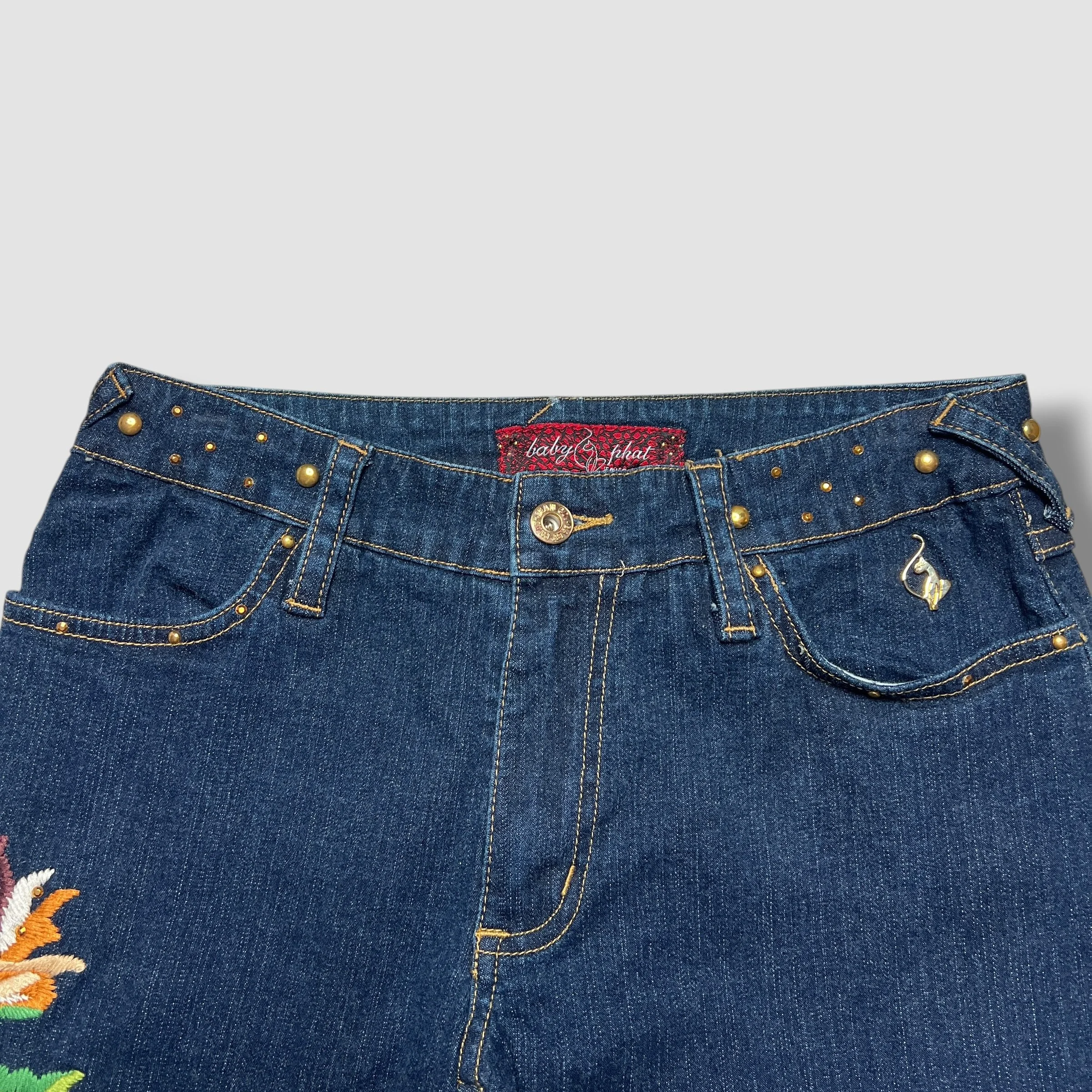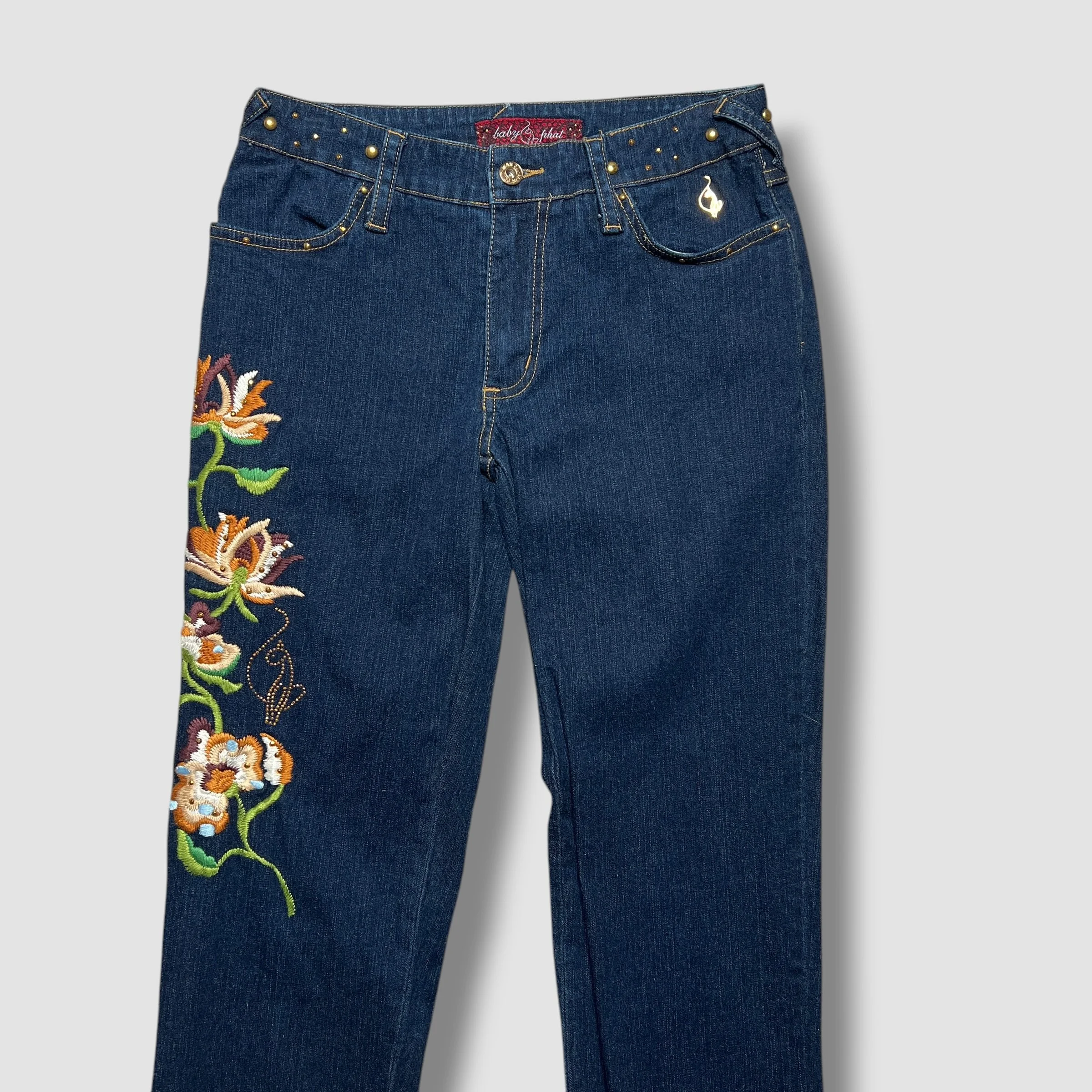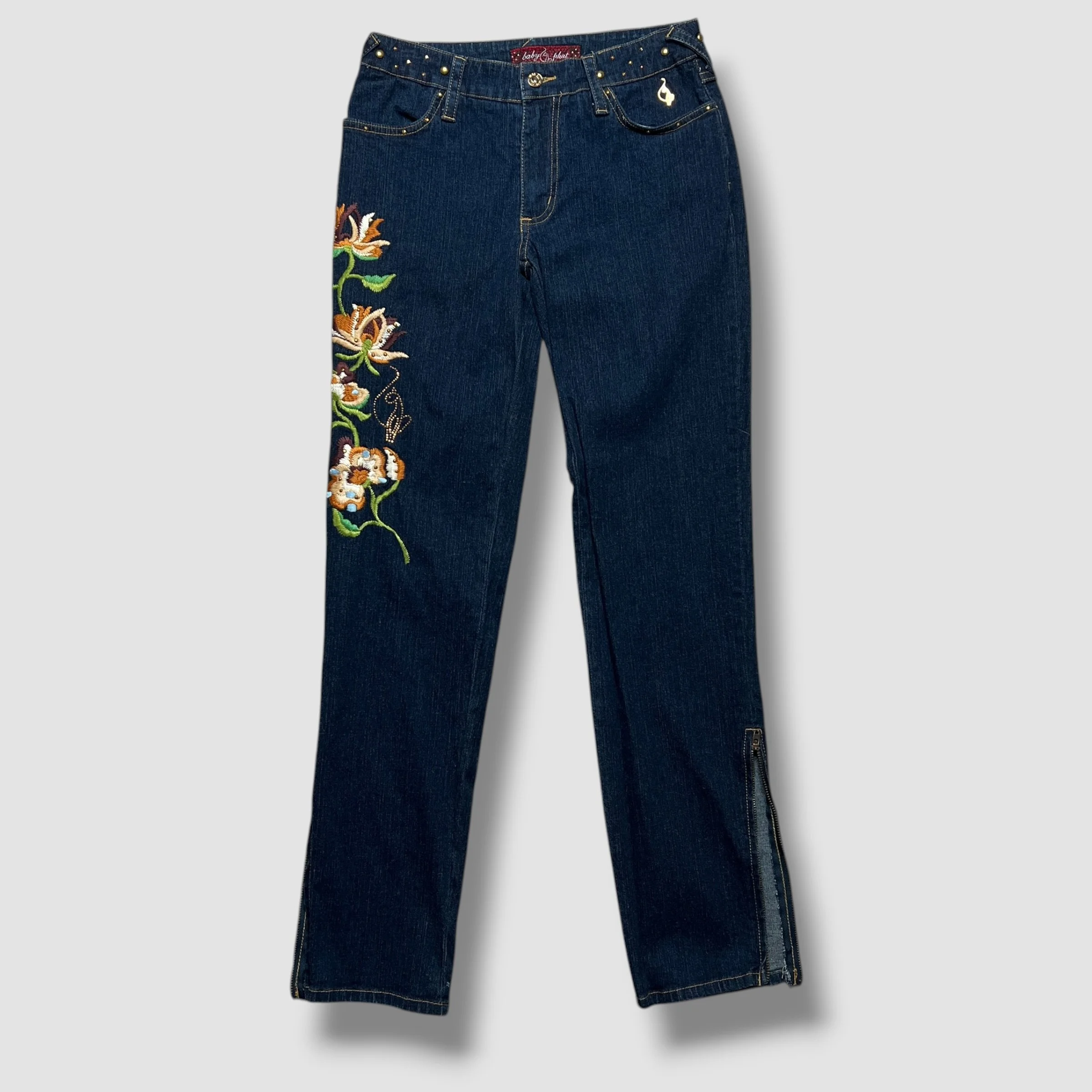 Baby Phat Denim Floral Embellished Jeans With Rhinestones and Zipper Detailing at Bottom of Legs
