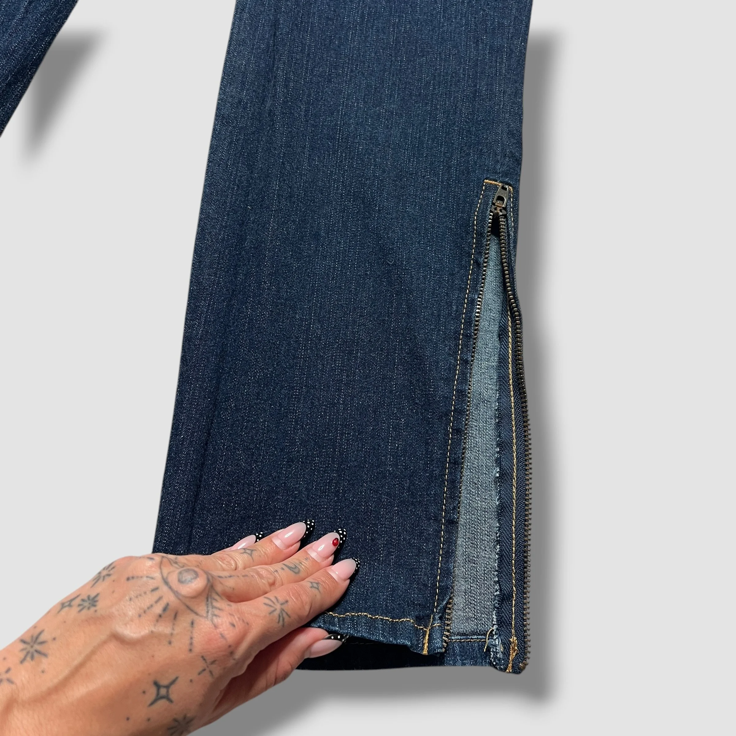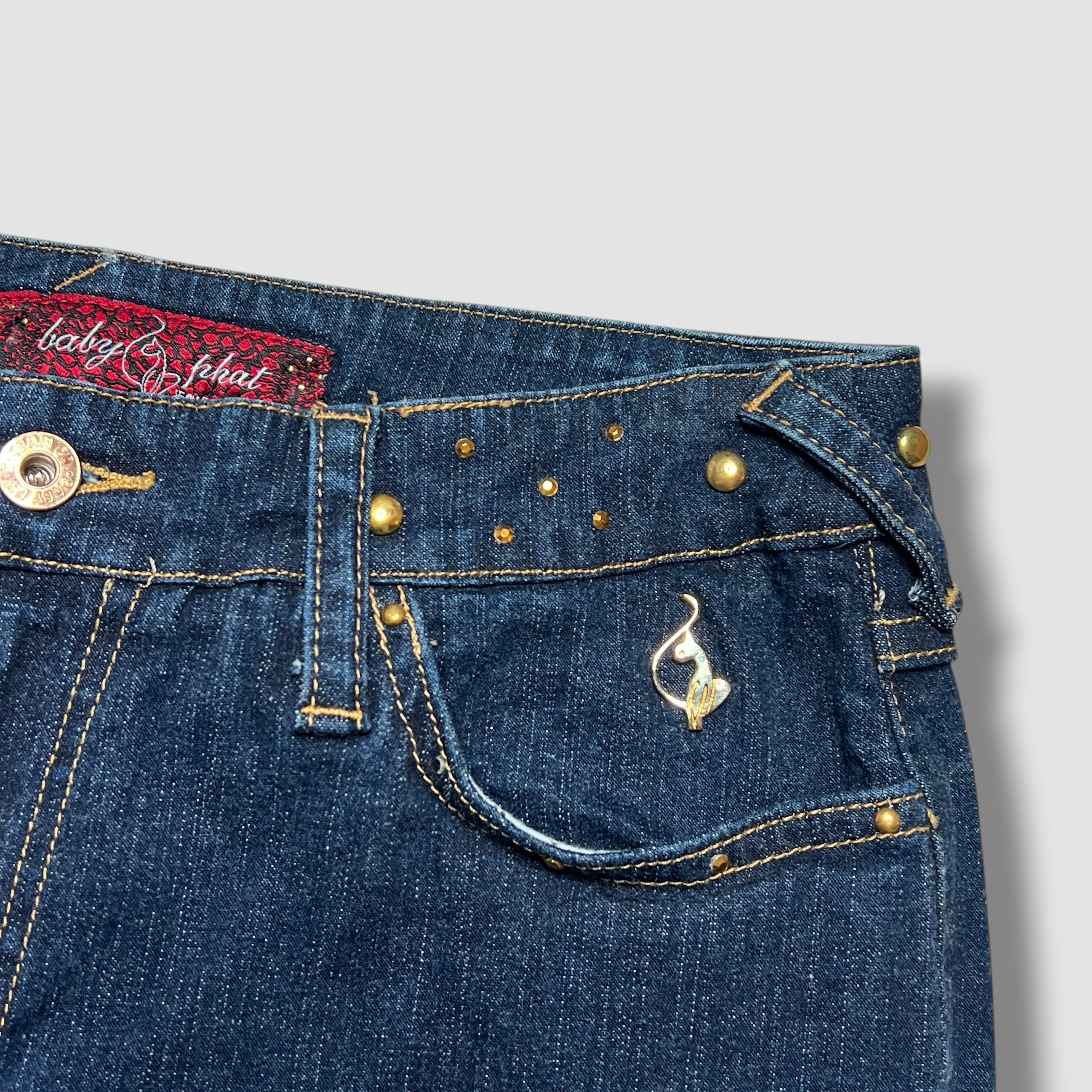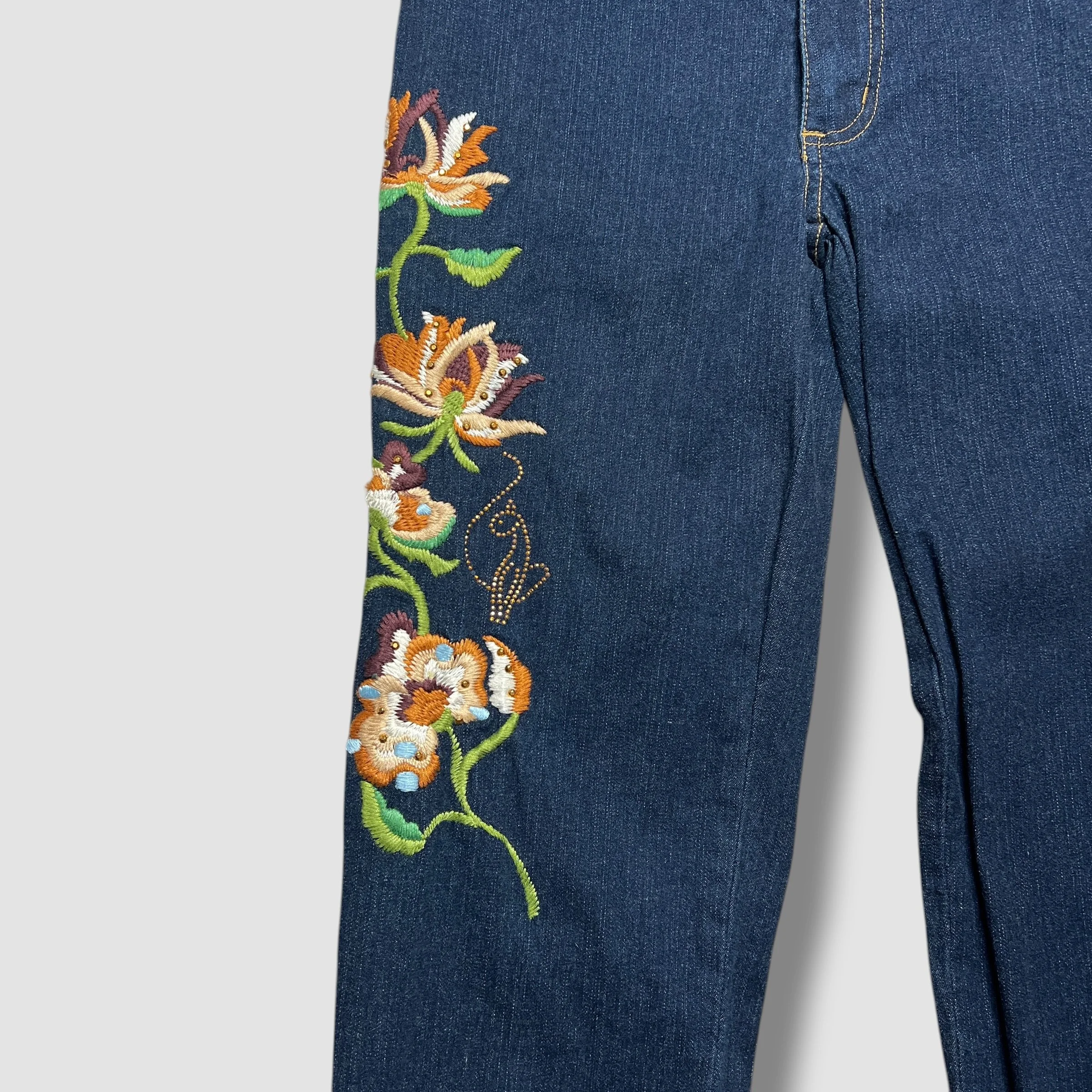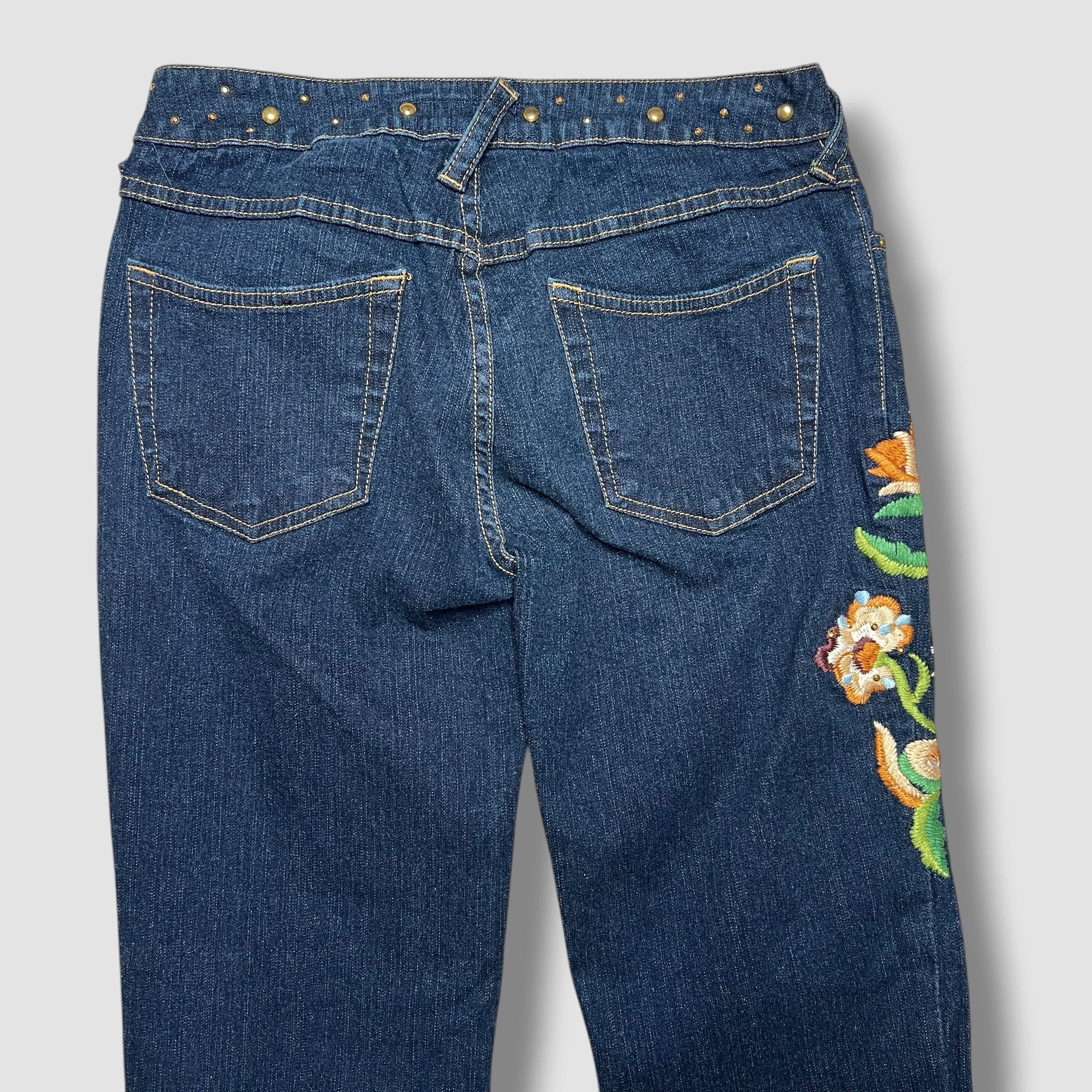 Baby Phat Denim Floral Embellished Jeans With Rhinestones and Zipper Detailing at Bottom of Legs