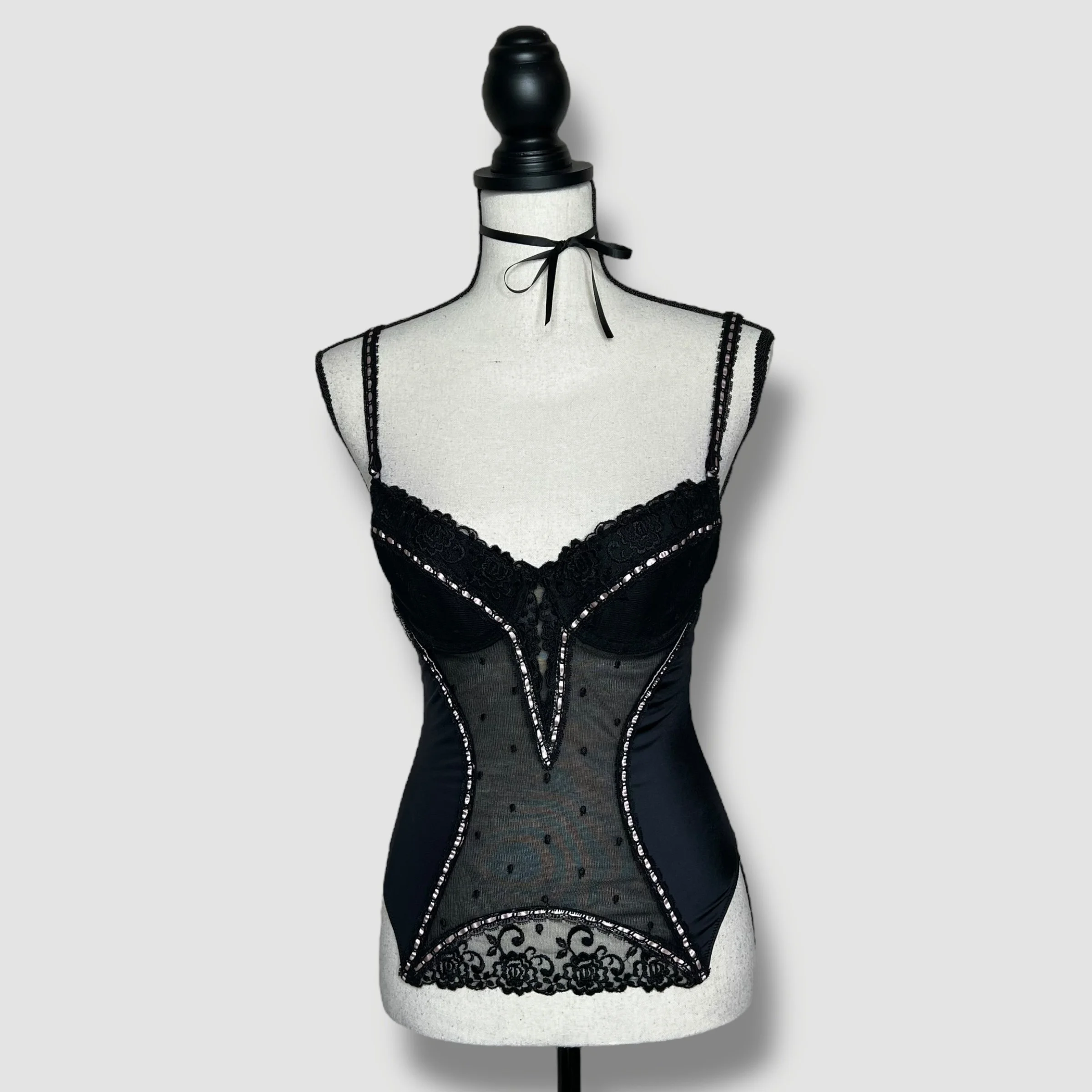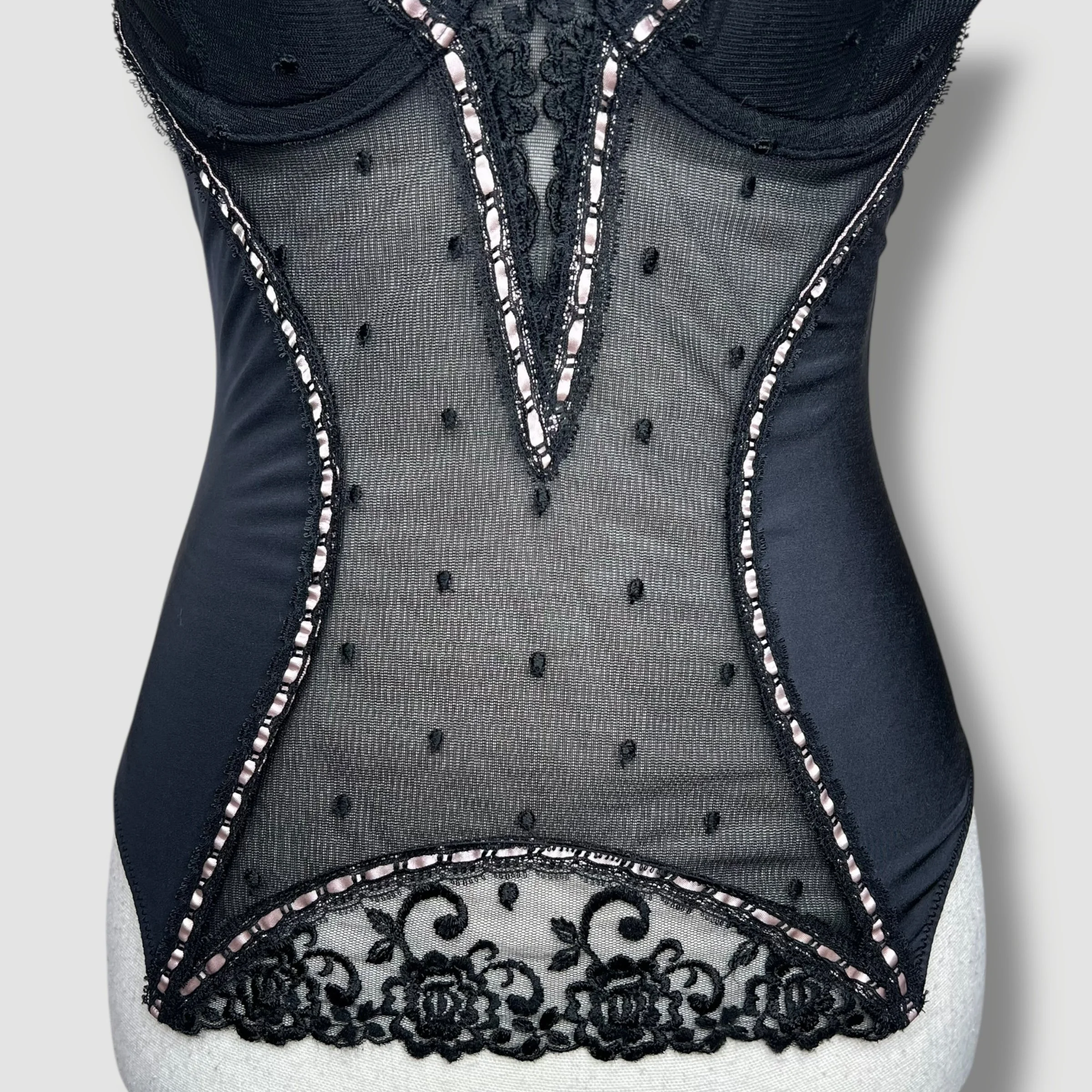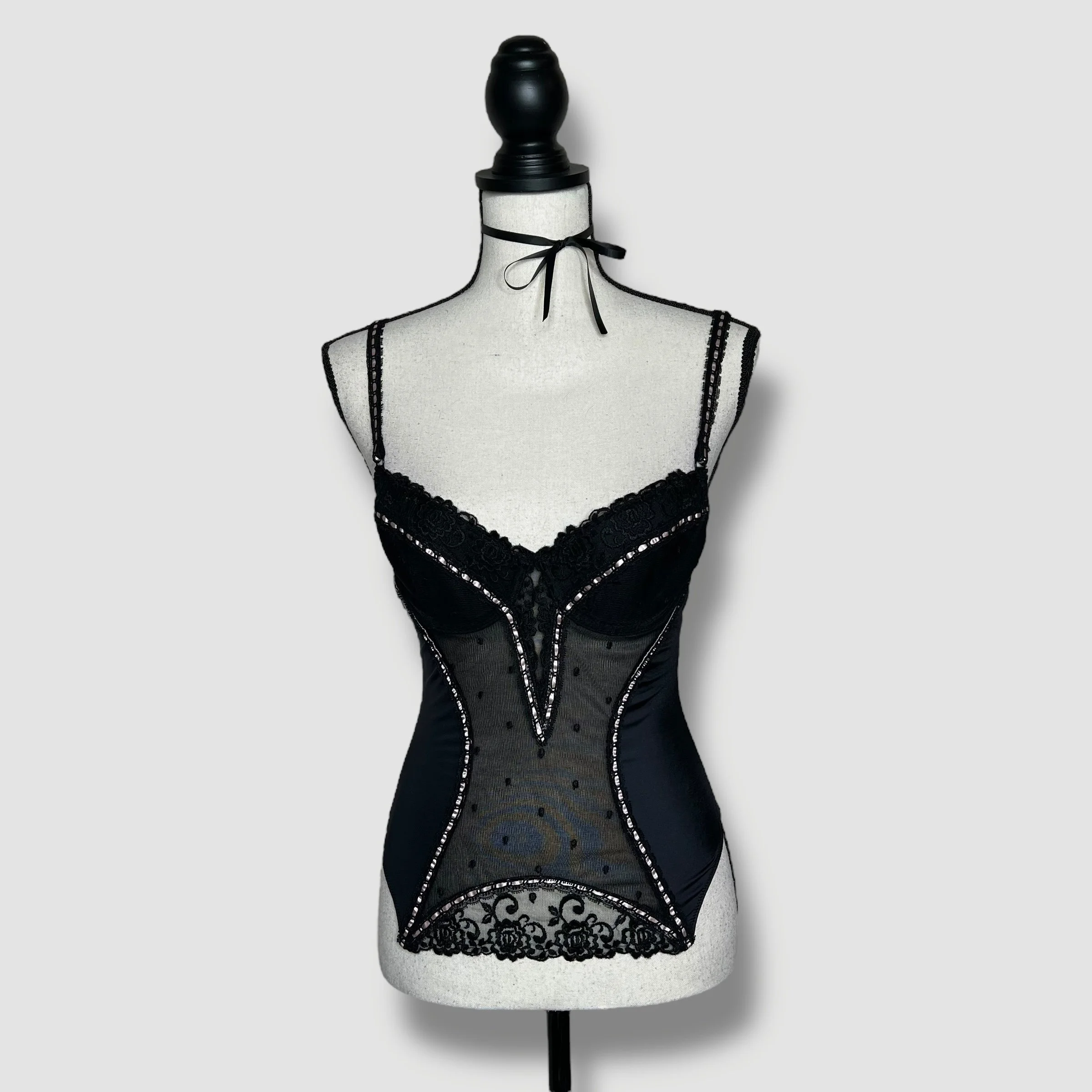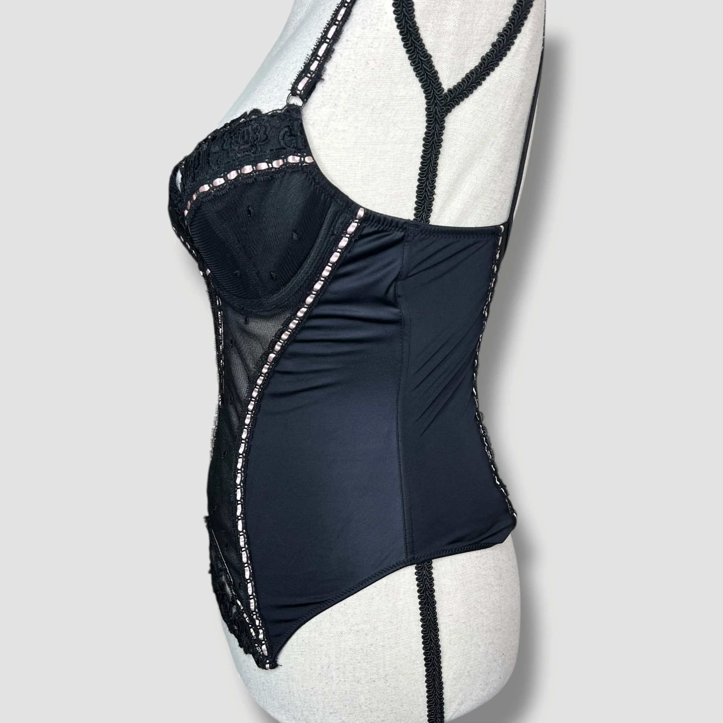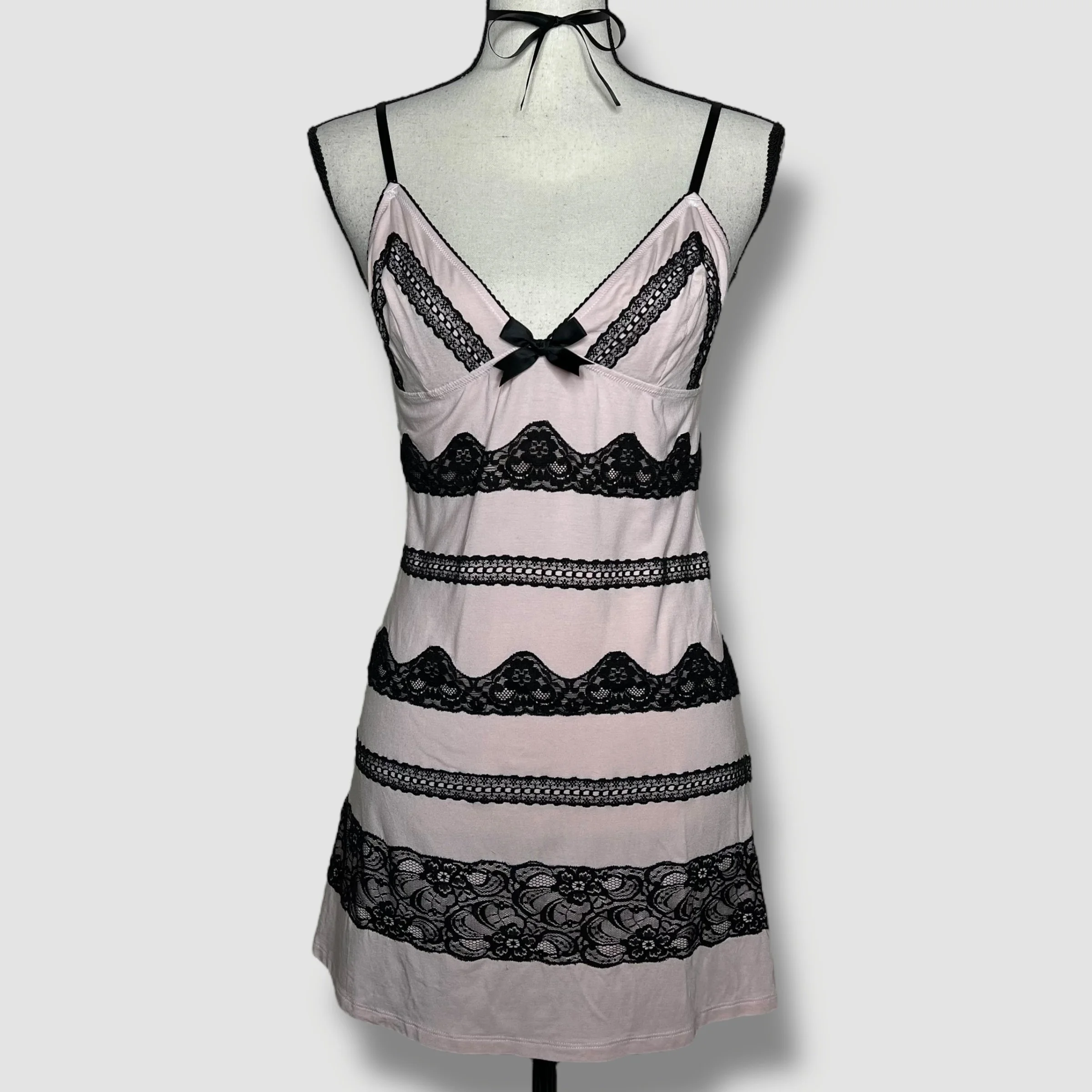 Y2K Charlotte Russe Coquette Black & Baby Pink Bow Lacey & Mesh Corset Top