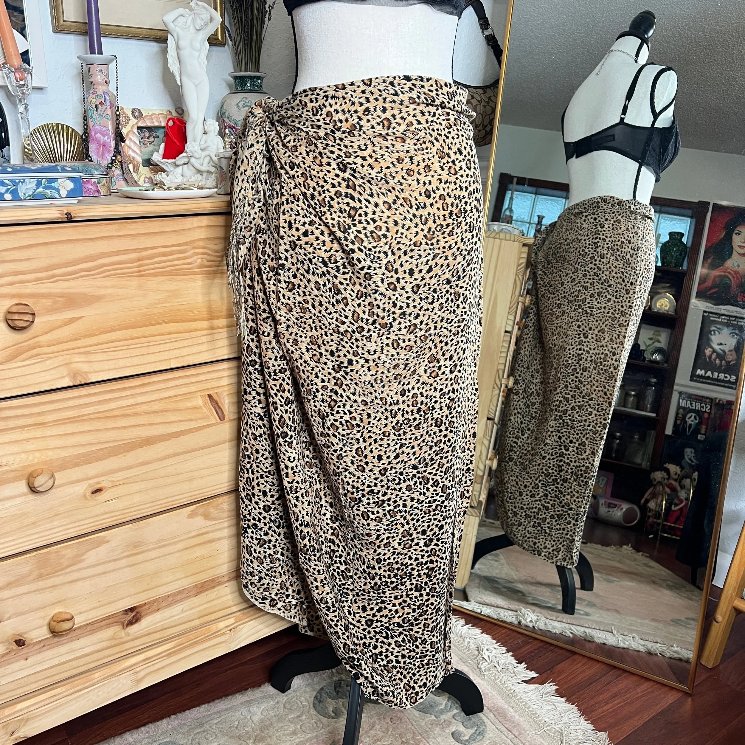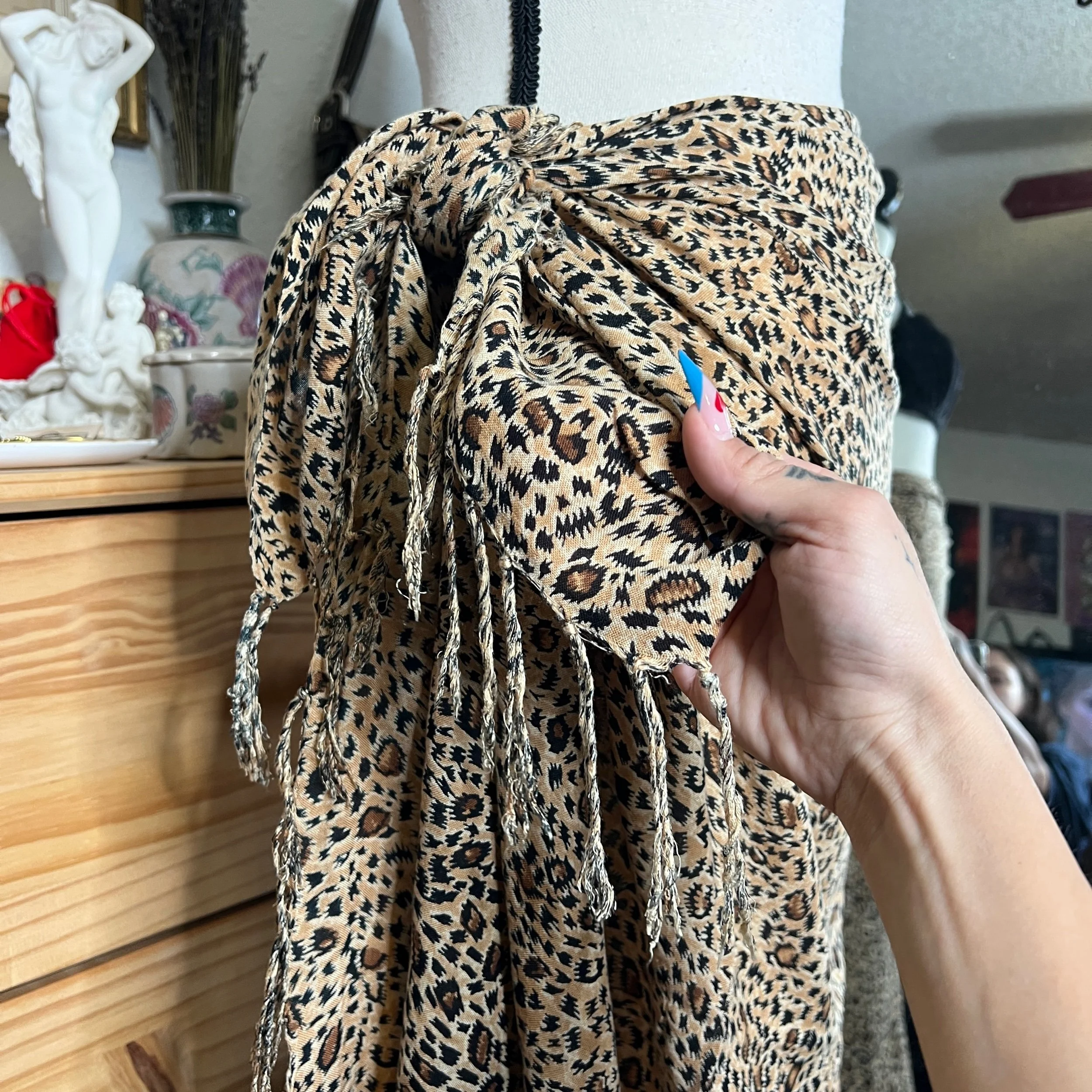 Y2K Beachwear Leopard Print Sarong Wrap Skirt $20.00 Leopard Print Sarong Wrap Skirt With Fringe Detail Can be tied or pinned and worn in many styles Condition: Excellent Shop › Y2K Beachwear Leopard Print Sarong Wrap Skirt Add To Cart Added! Leopard Print Sarong Wrap Skirt With Fringe Detail Can be tied or pinned and worn in many styles Condition: Excellent