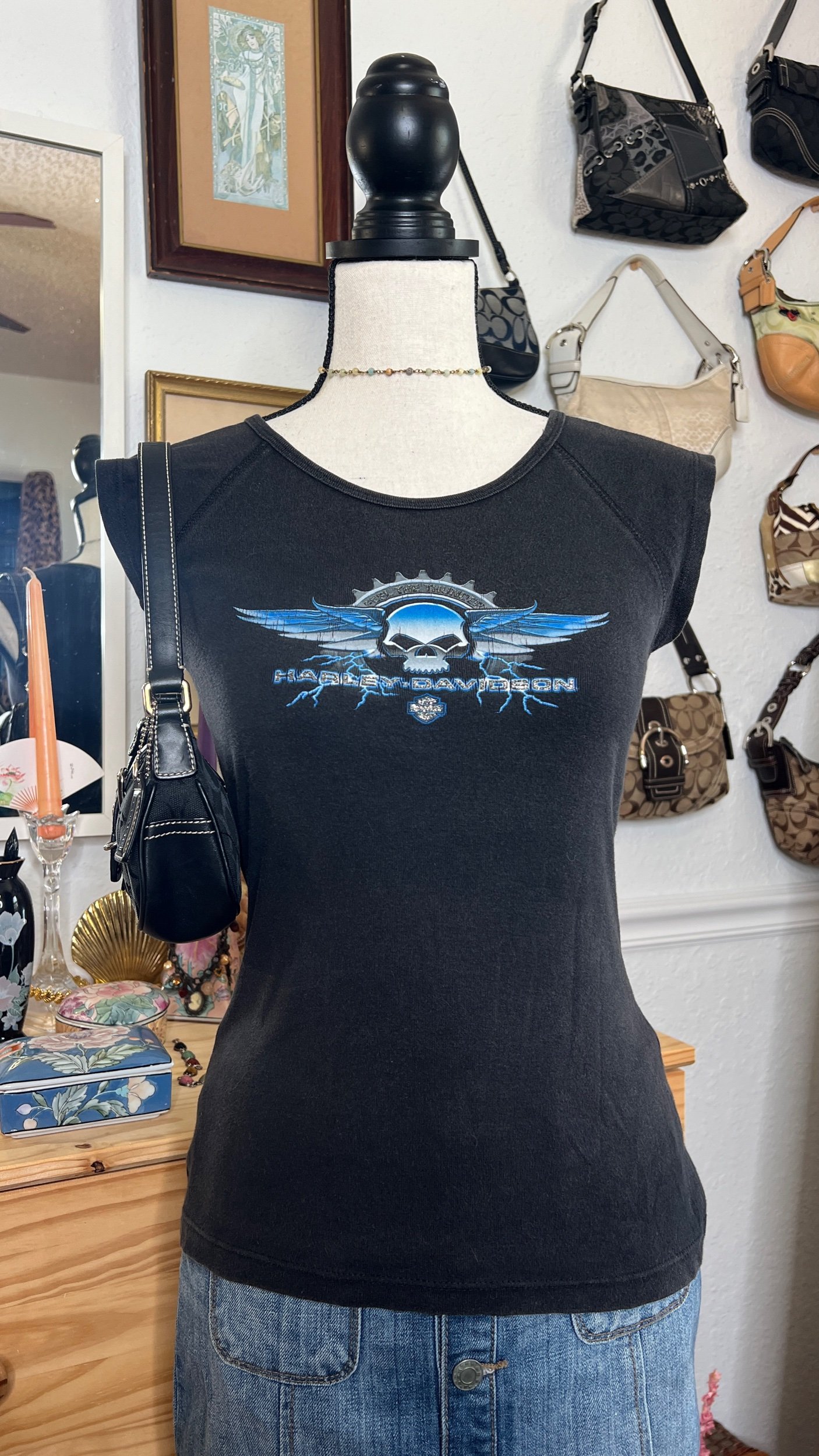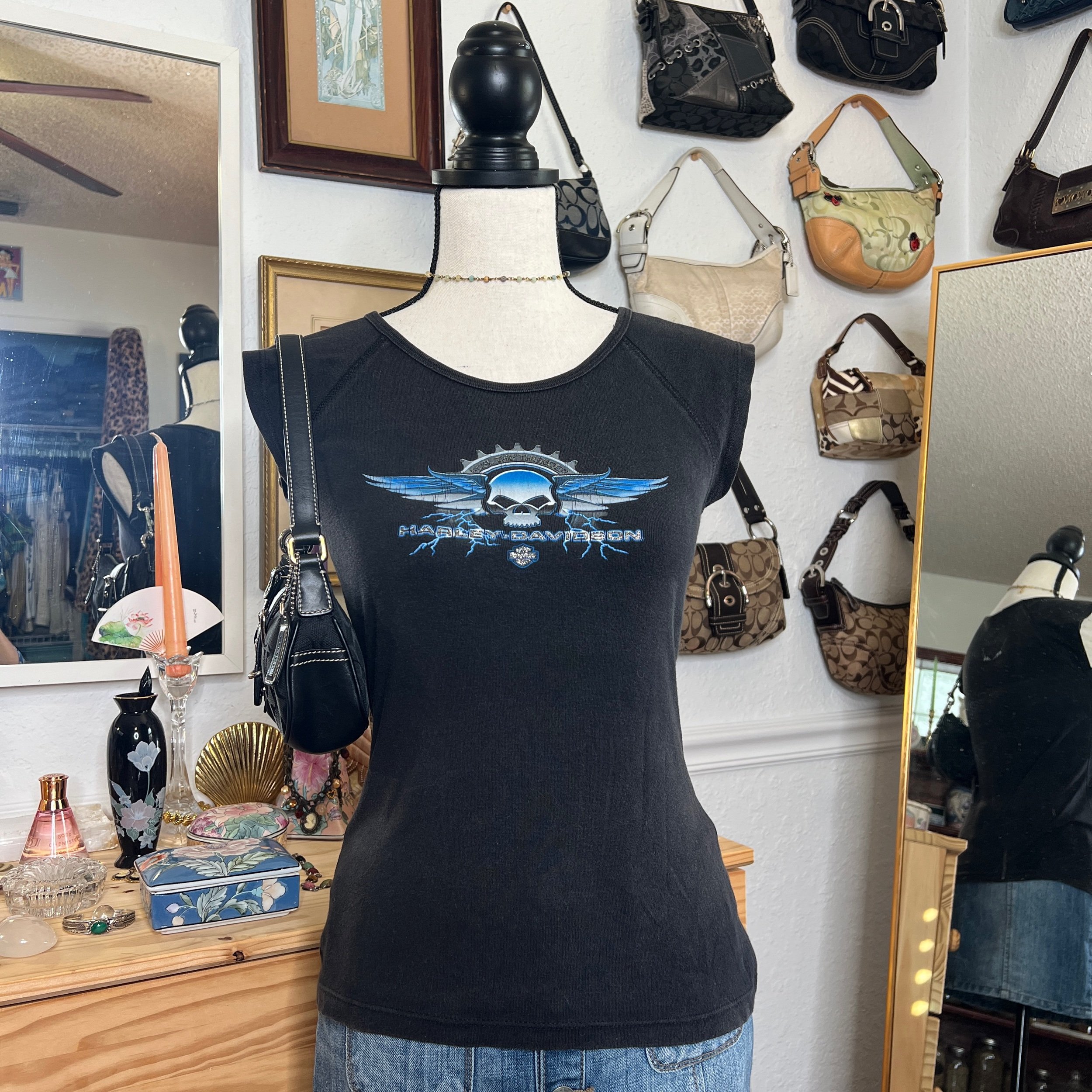 Harley Davidson Sparkly Winged Skull Baby Tee $33.00 Harley Davidson Sparkly Black and Blue Winged Skull Baby TeeTagged Size: MediumCondition: Good Shop › Harley Davidson Sparkly Winged Skull Baby Tee Add To Cart Added! Harley Davidson Sparkly Black and Blue Winged Skull Baby TeeTagged Size: MediumCondition: Good