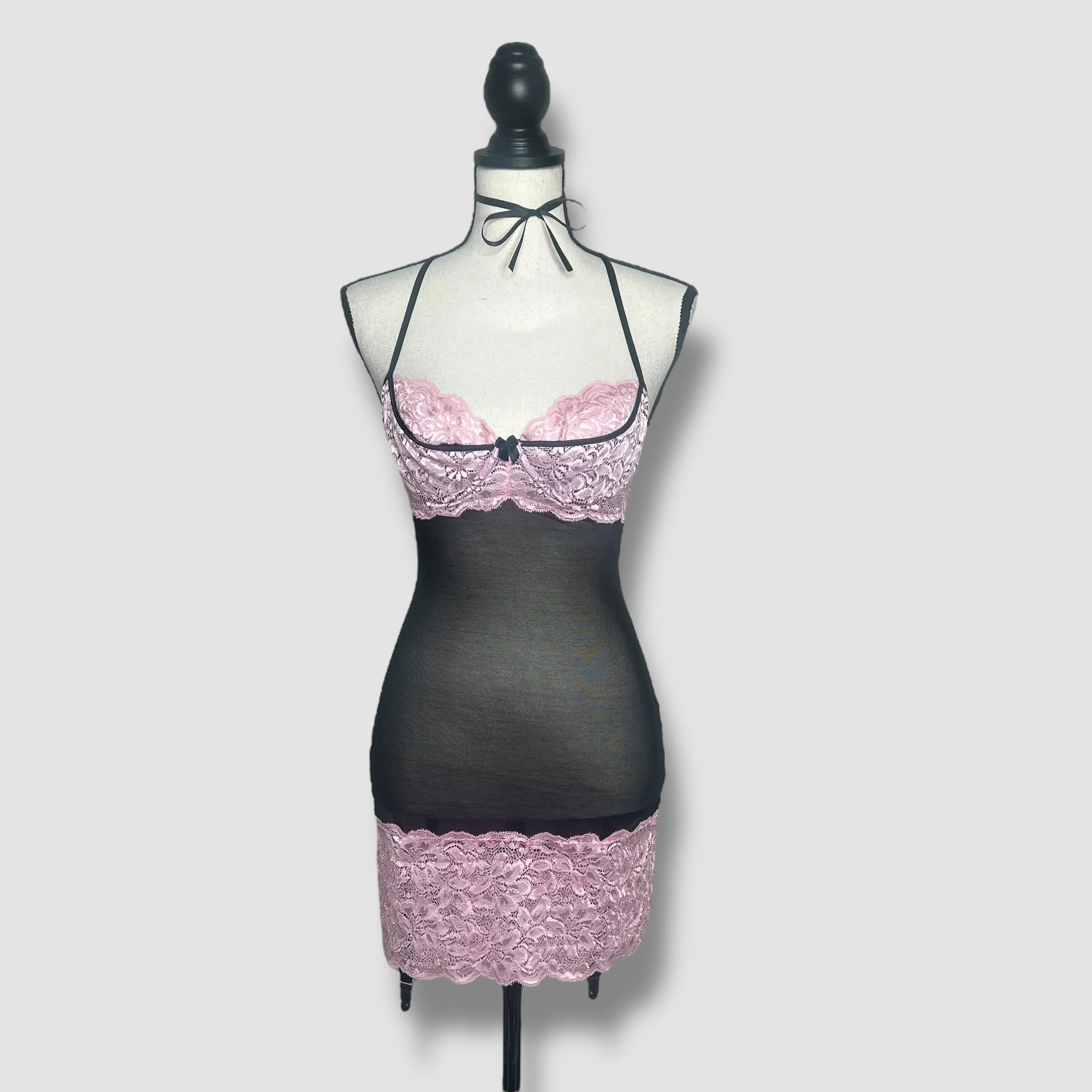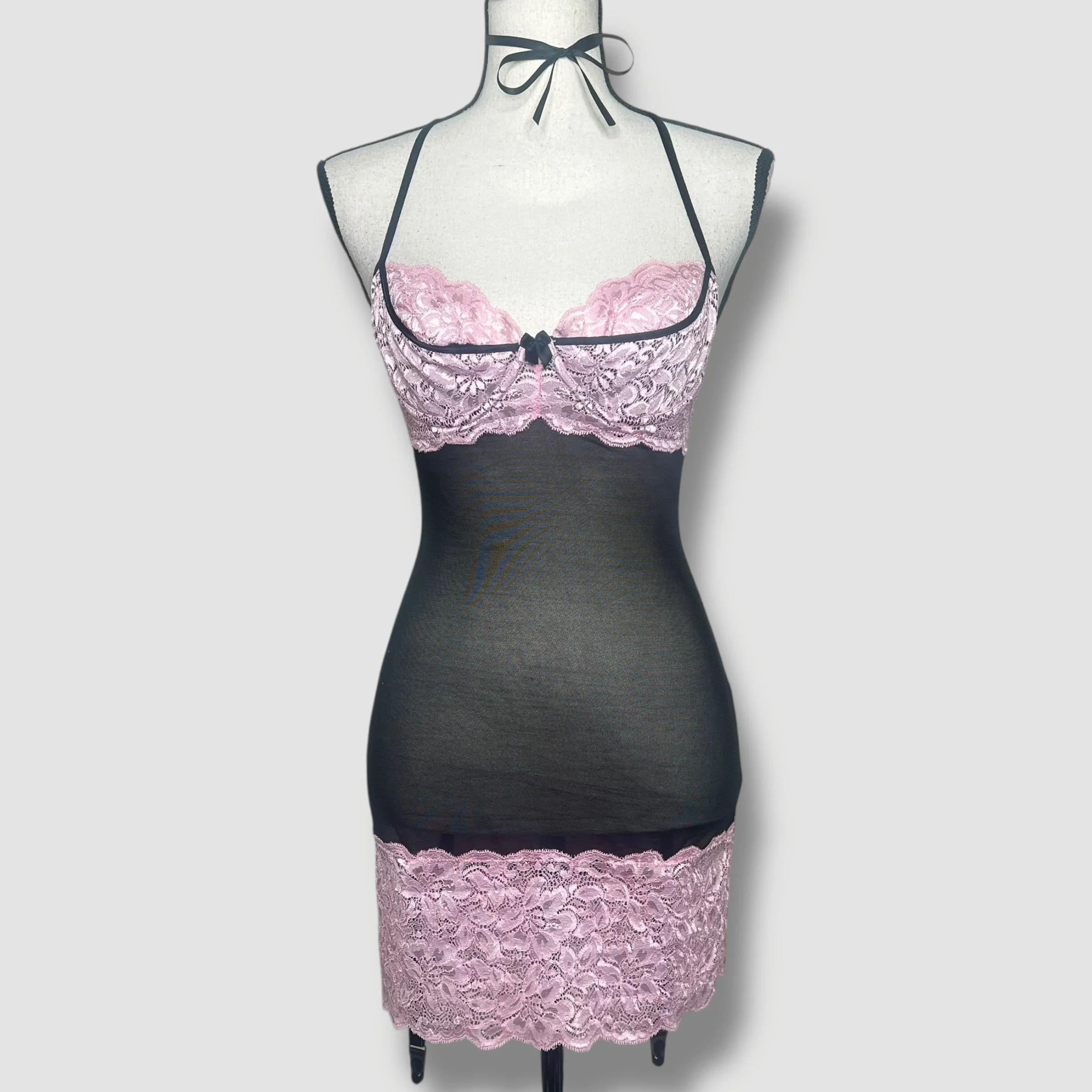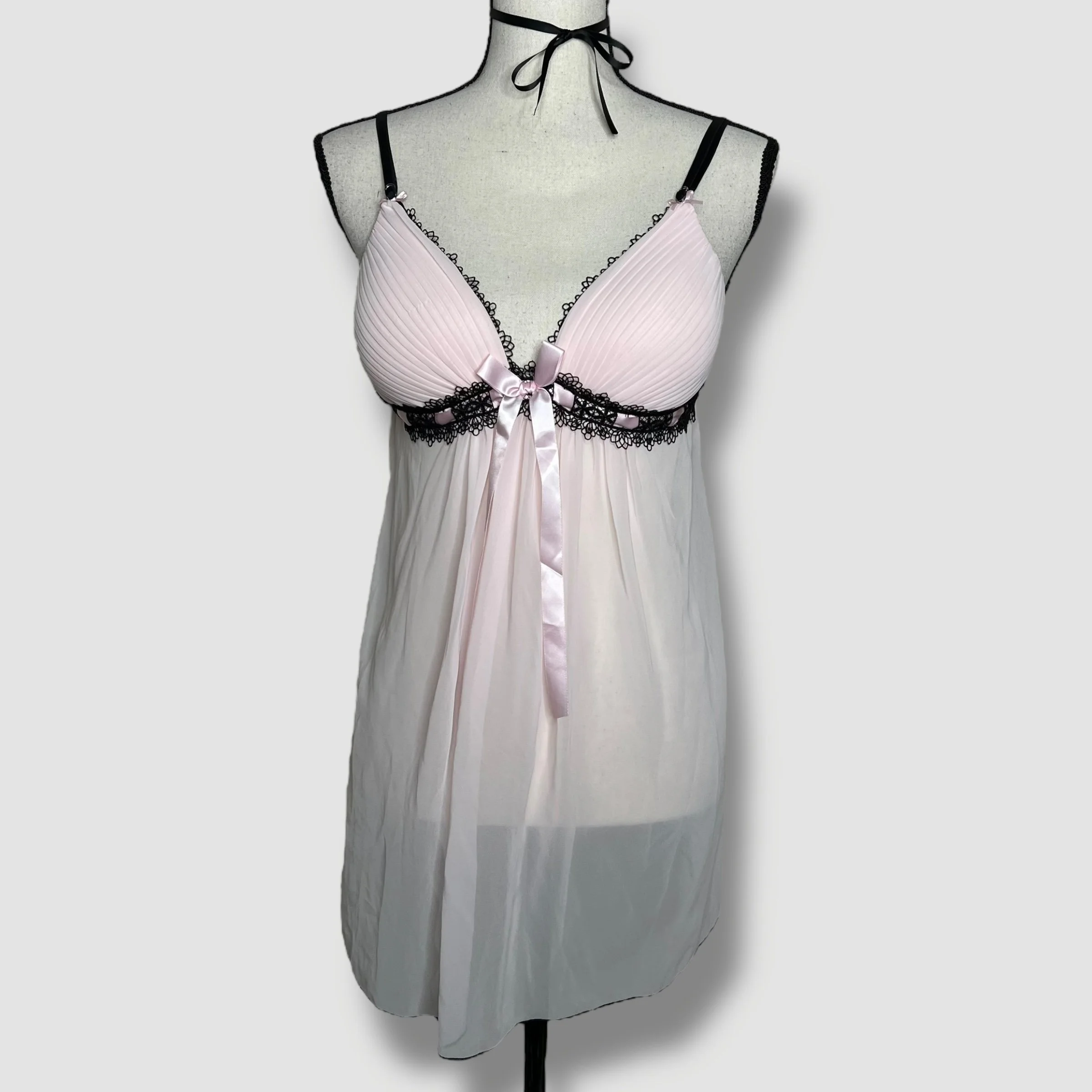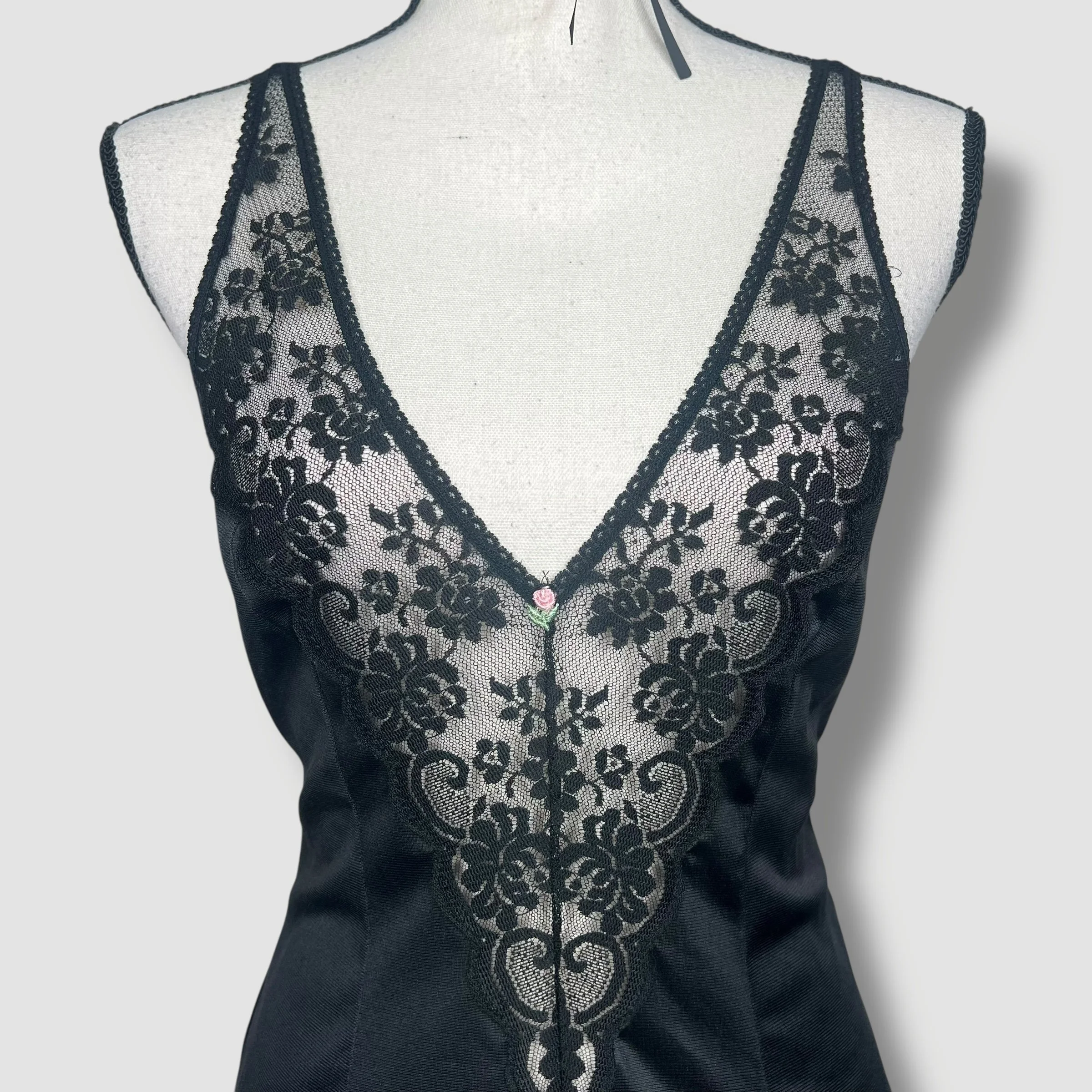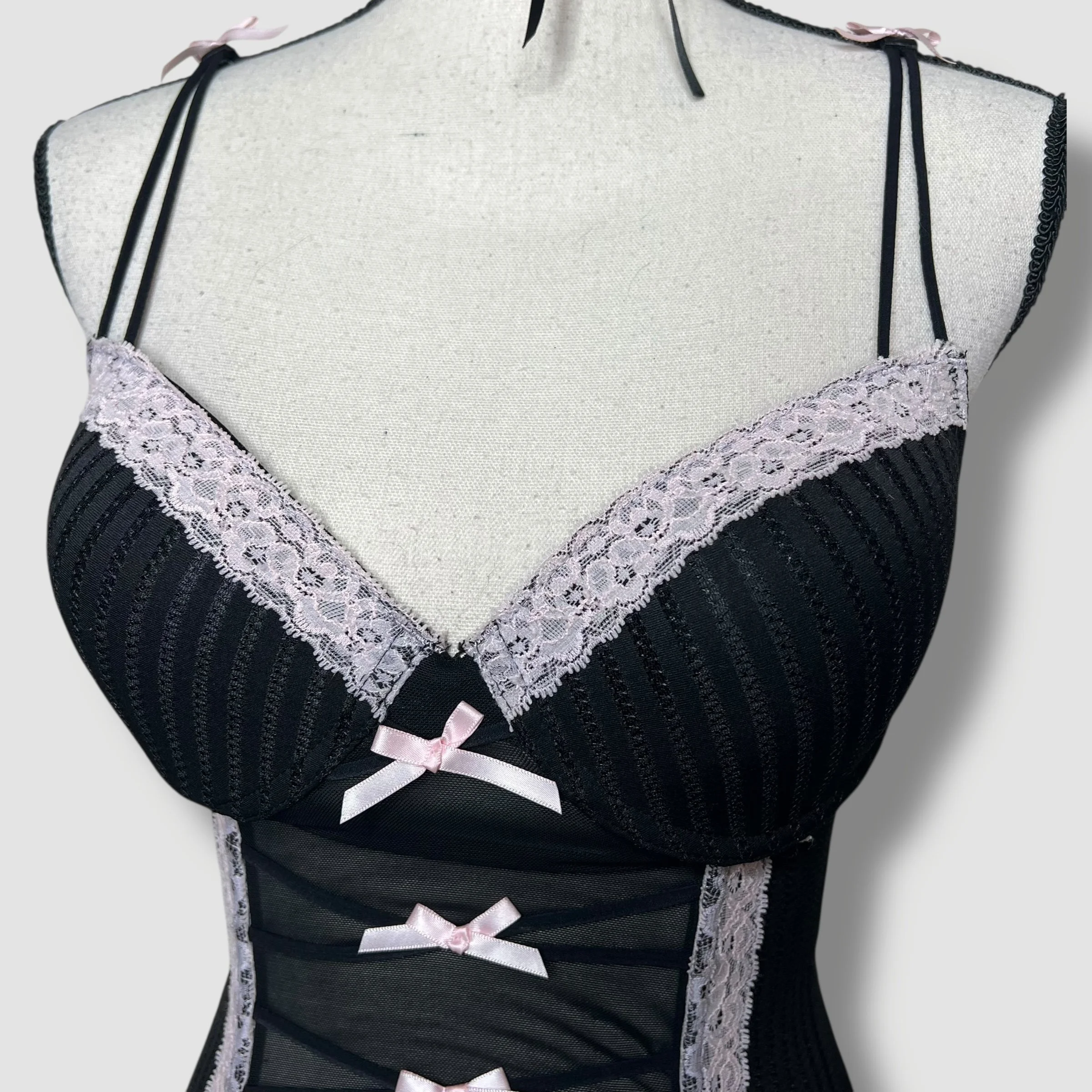 Vintage Black Lace Slip Dress With Baby Pink Bows