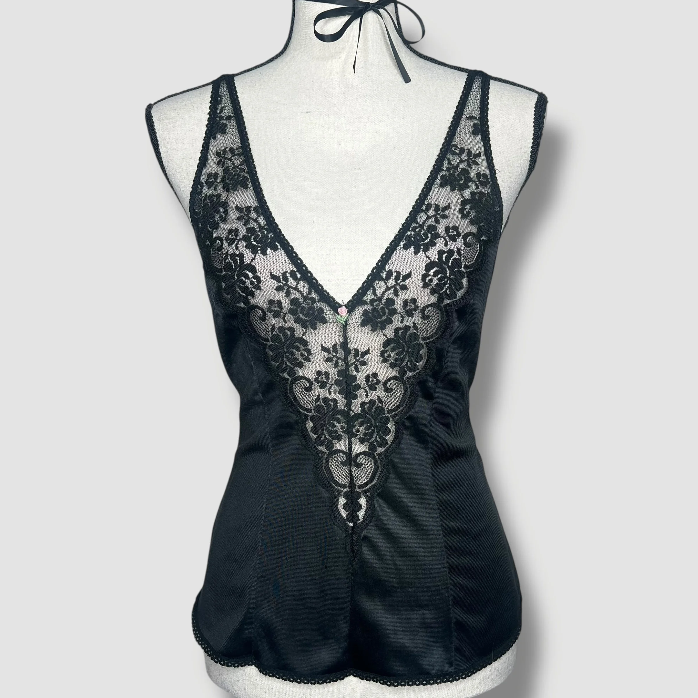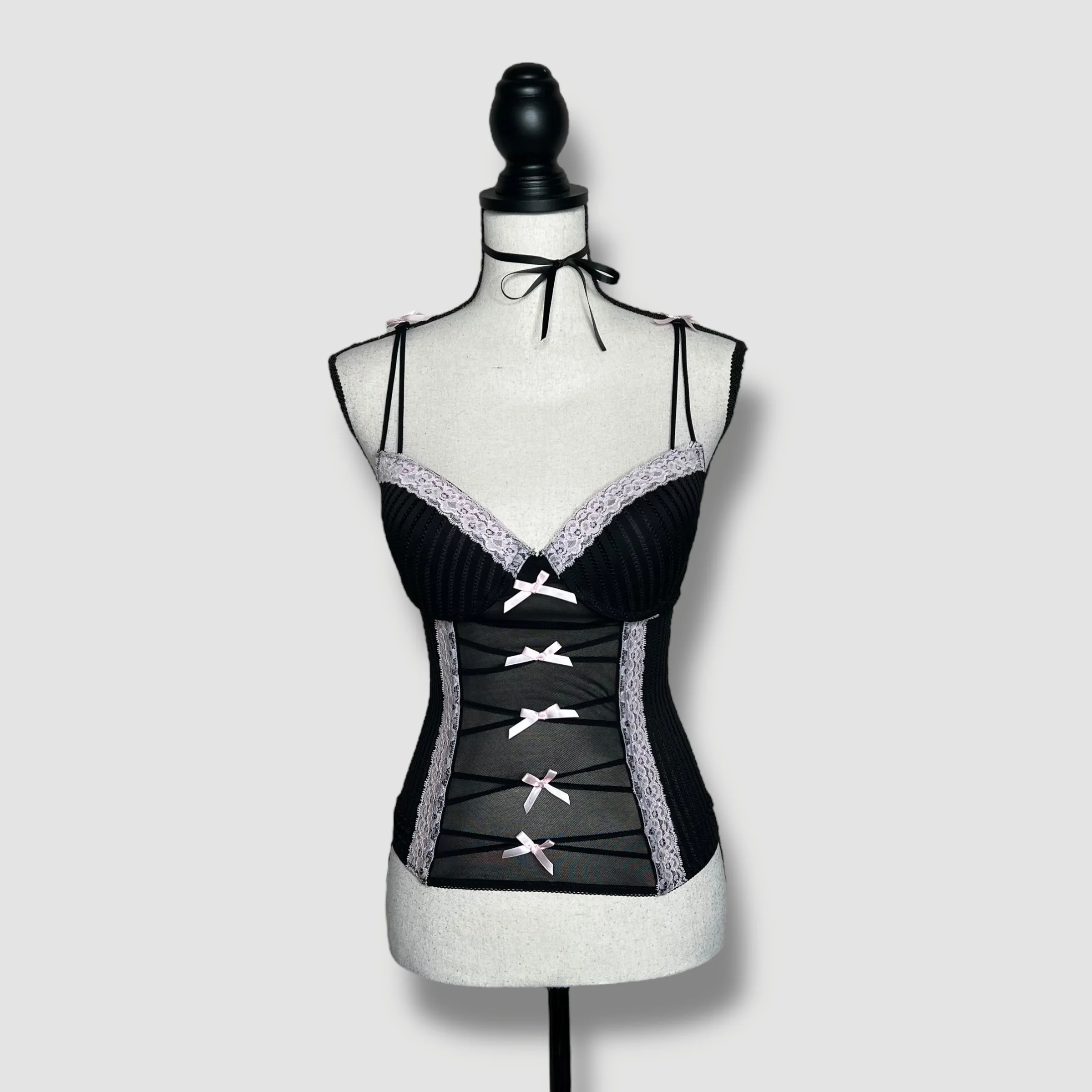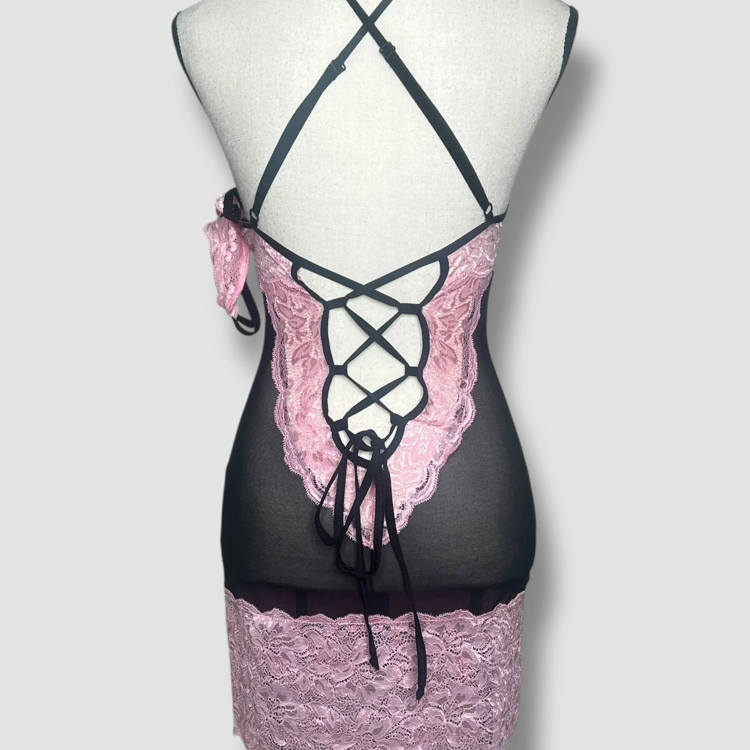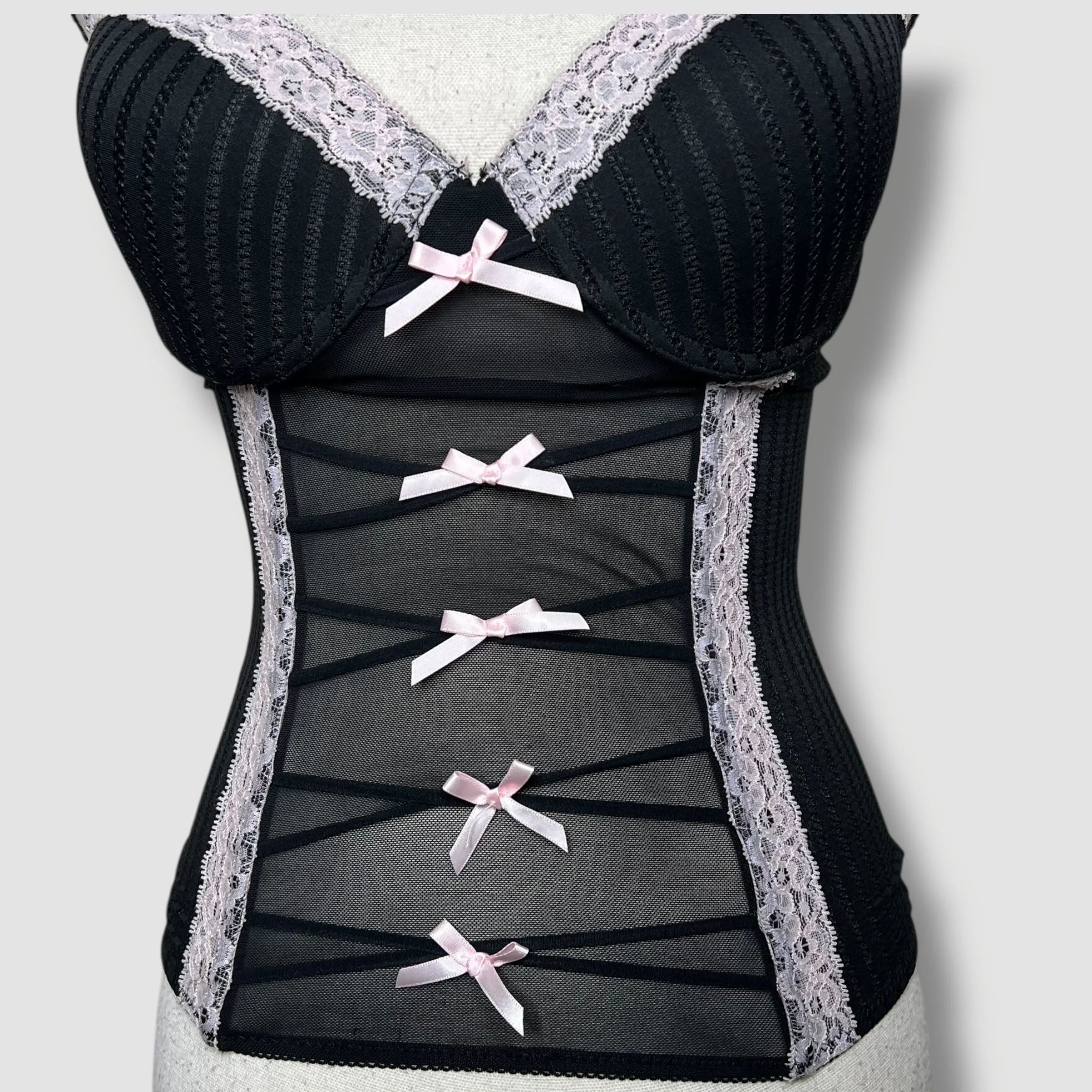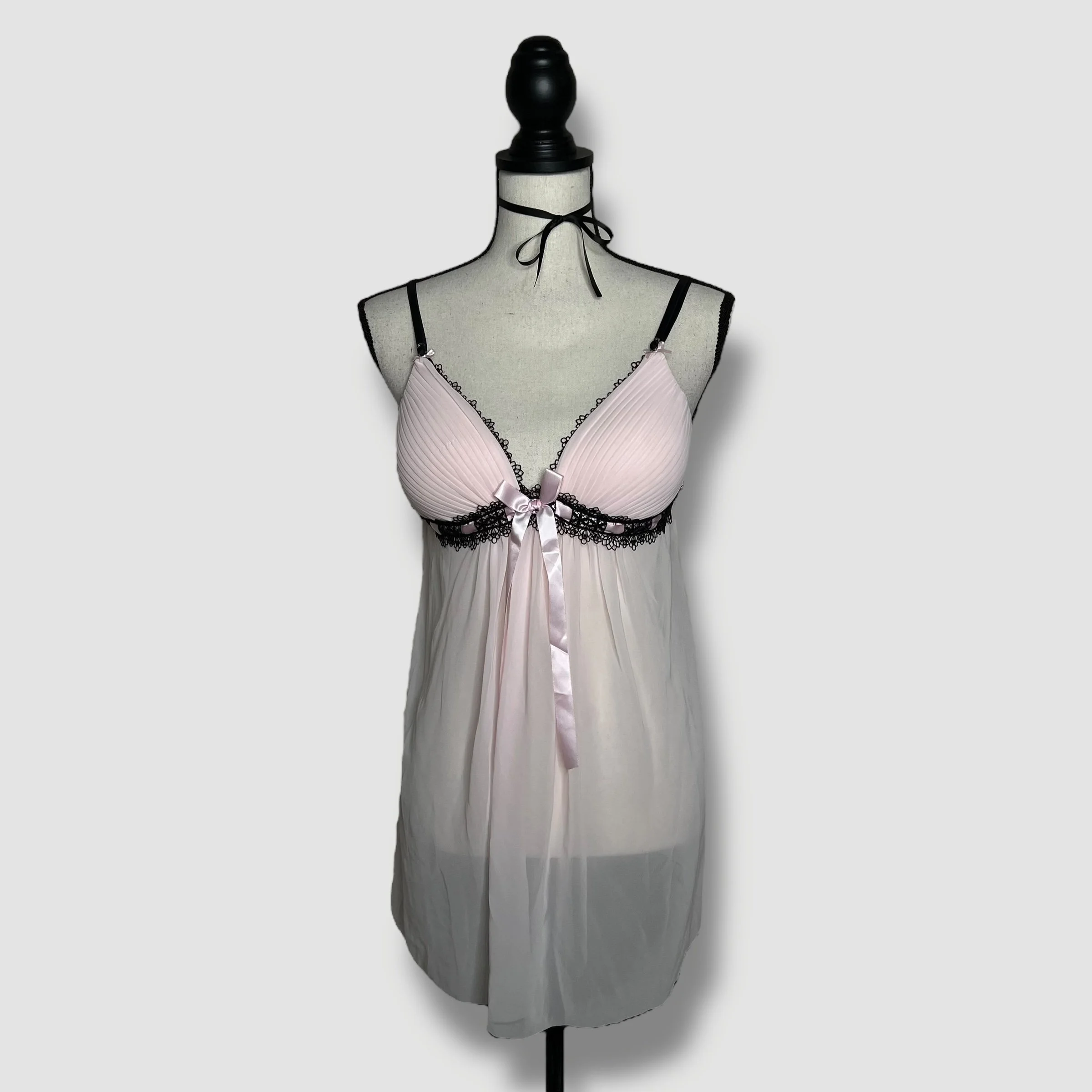 Vintage Black Lace Slip Dress With Baby Pink Bows